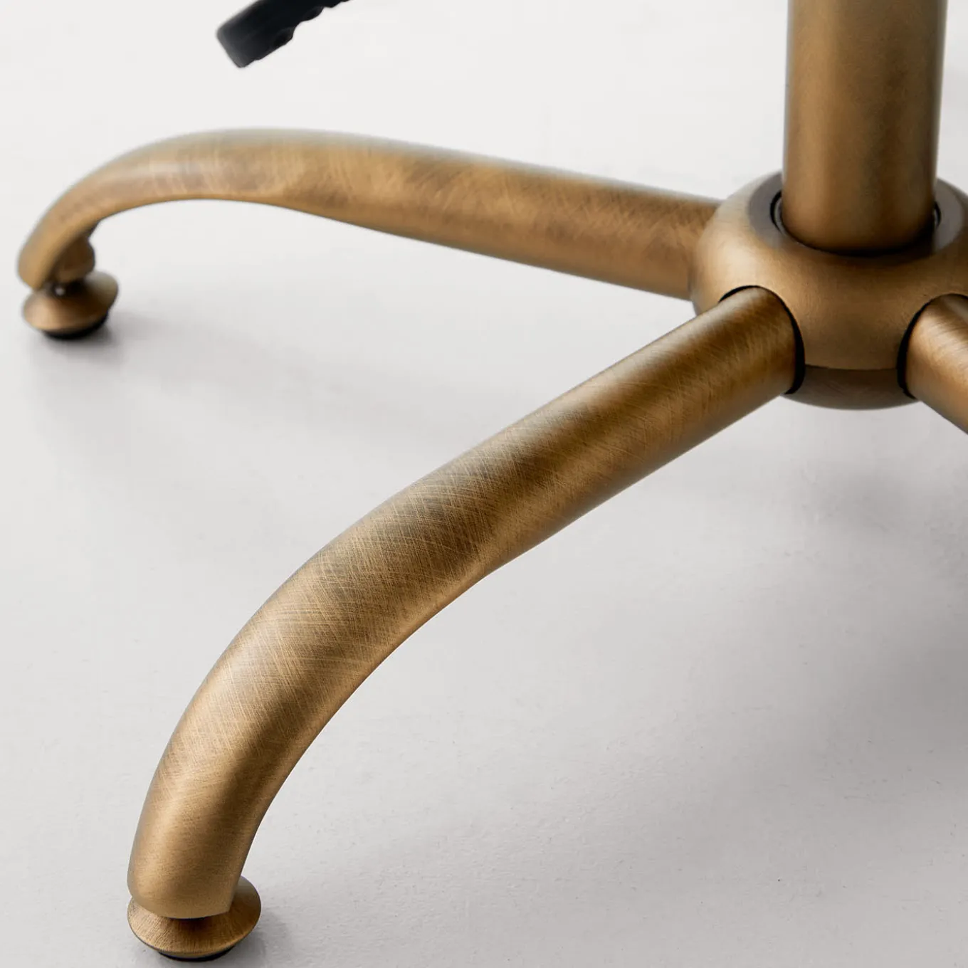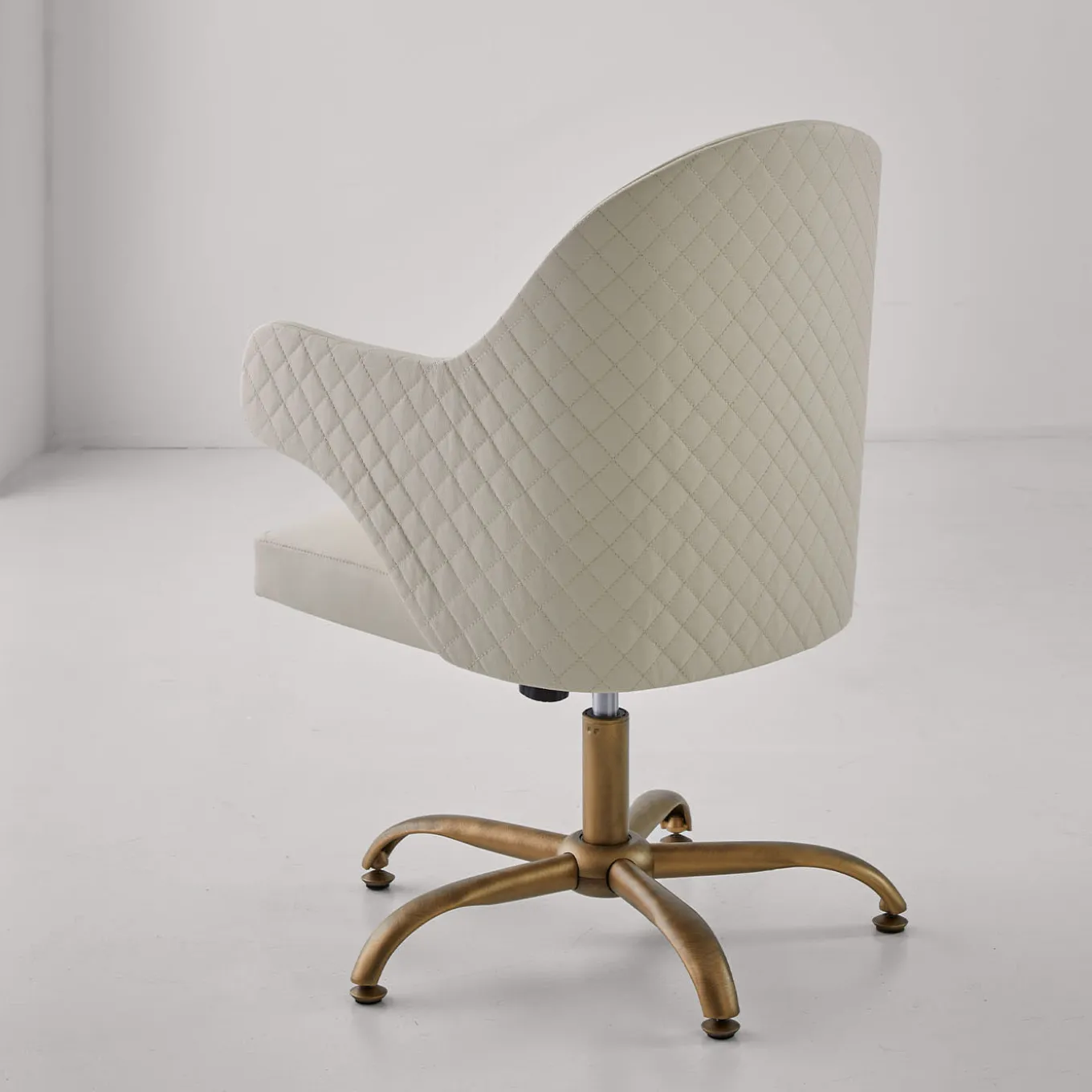 Sedia girevole e regolabile in altezza con base laccata bronzo e interamente rivestita in pelle con trapuntatura sullo schienale.