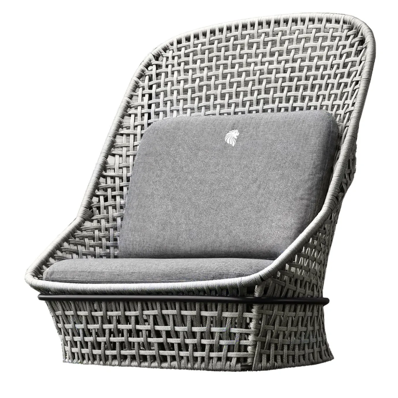 Sedia occasionale per esterni con schienale alto disponibile in tessuto appositamente trattato. Imbottitura del cuscino in dacron impermeabile. Struttura in una combinazione di metallo nero satinato trattato in cataforesi con logo Giorgio Collection inserito e cordame grigio intrecciato. Speciale copertura per esterni inclusa nel prezzo. Design di Castello Lagravinese Studio. Contattare il concierge per la personalizzazione del tessuto.