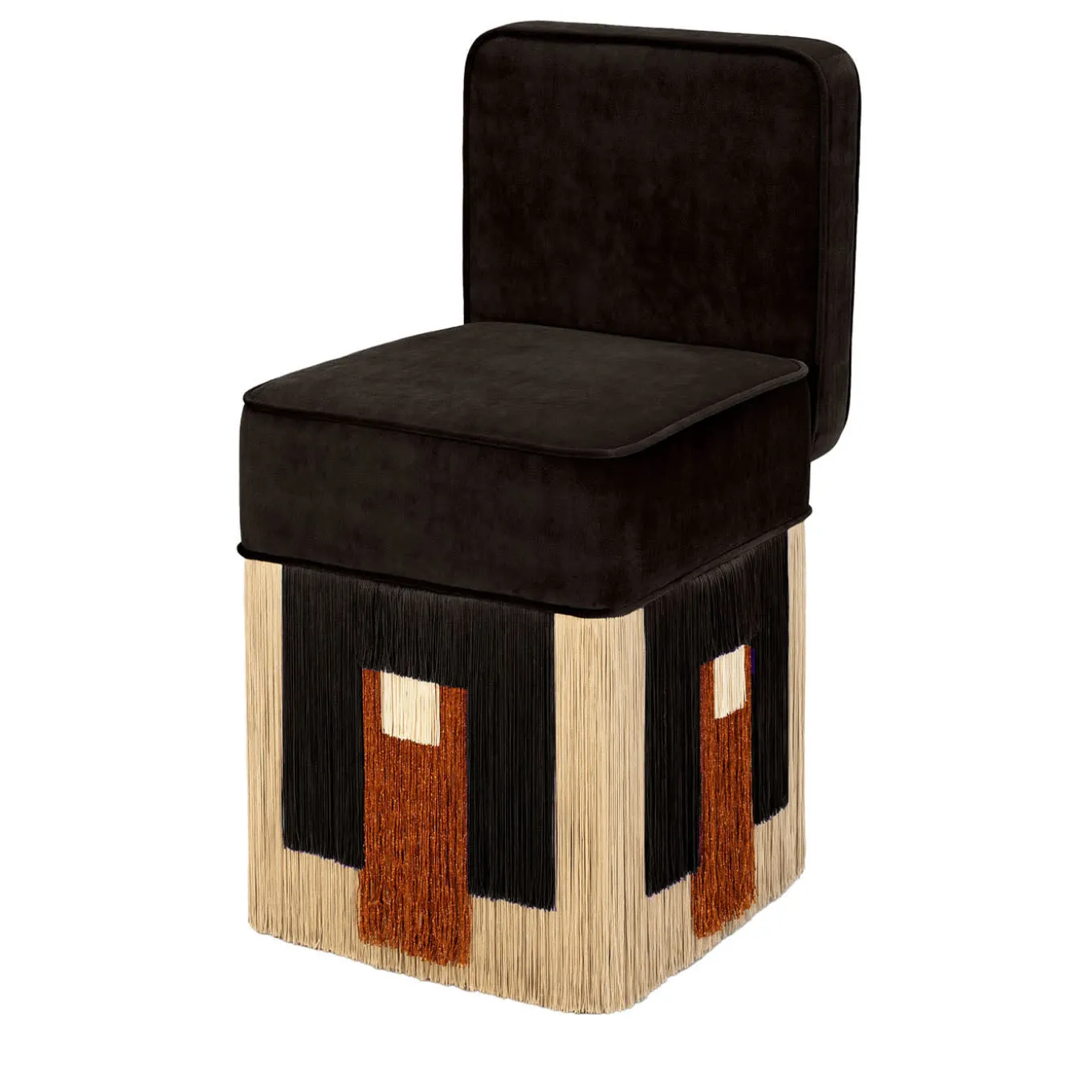 Disegnata da Lorenza Bozzoli, la sedia Lilli Cleo è sinonimo di versatilità e comfort. Il suo design elegante passa con disinvoltura dagli angoli intimi della camera da letto agli ambienti eleganti della sala da pranzo, assicurando un supporto superiore per la parte bassa della schiena. La seduta è impreziosita da un lussuoso velluto nero e da frange geometriche accentuate da riflessi rame e dettagli avorio. Questo pezzo non solo valorizza gli interni con un fascino minimalista, ma è anche una dichiarazione di stile e comfort senza tempo. Ogni pezzo su misura è stampato sul fondo della fodera del pouf e firmato, numerato e datato personalmente dal designer.