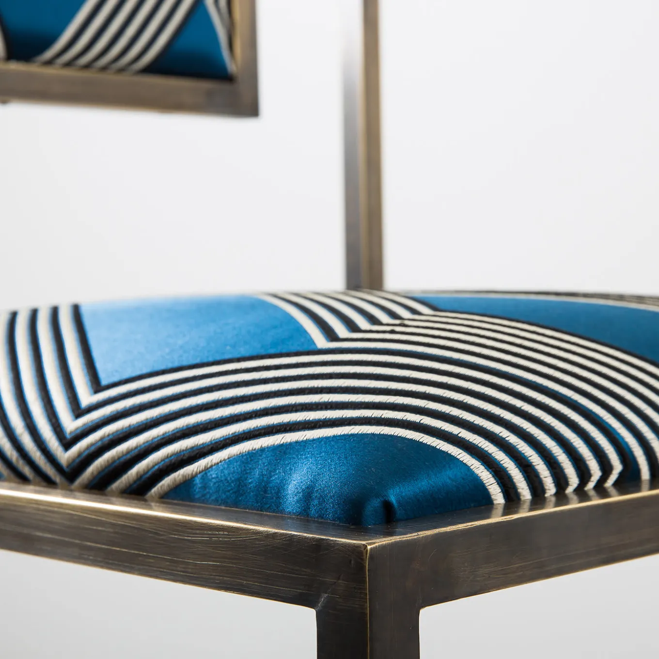 Semplice nel design, lo stile minimalista conferisce un’aria di grazia a questa sedia in ferro verniciato nero disegnata da Francesco Della Femina e realizzata a mano da abili artigiani nei dintorni di Napoli. Ispirata all’atmosfera e ai colori glamour dell’isola di Capri, la comoda seduta e lo schienale sono rivestiti in tessuto blu “Funky Stripes” di Dedar Milano.