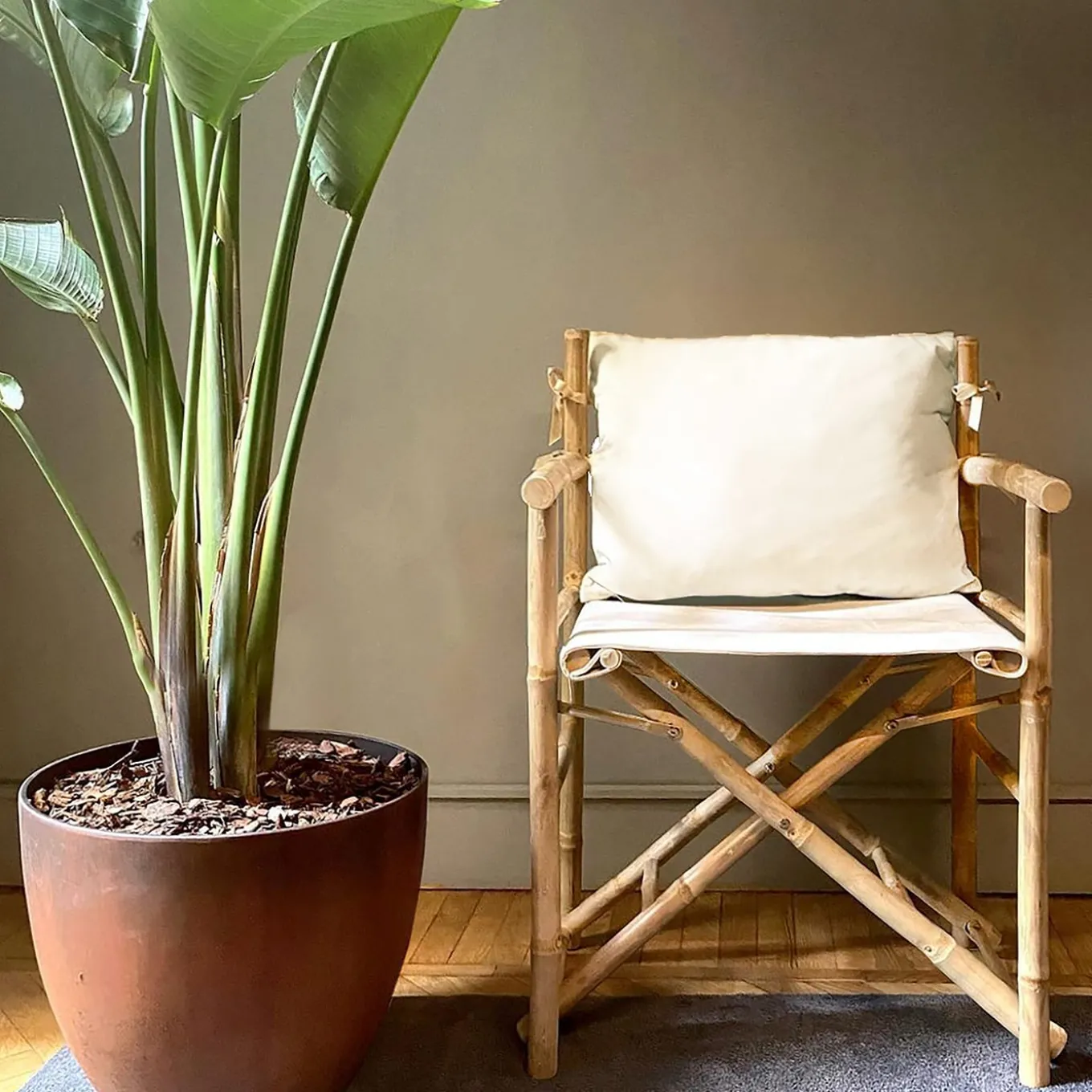 Sedia da regista con struttura in bambù. Lo schienale, costituito da un cuscino fissato al telaio con dei lacci laterali, è rinforzato internamente per garantire una seduta confortevole. Il rivestimento, completamente sfoderabile, è antimacchia e lavabile in acqua. Sono disponibili vari rivestimenti, in diversi livelli di qualità. Sono disponibili opzioni per uso esterno.