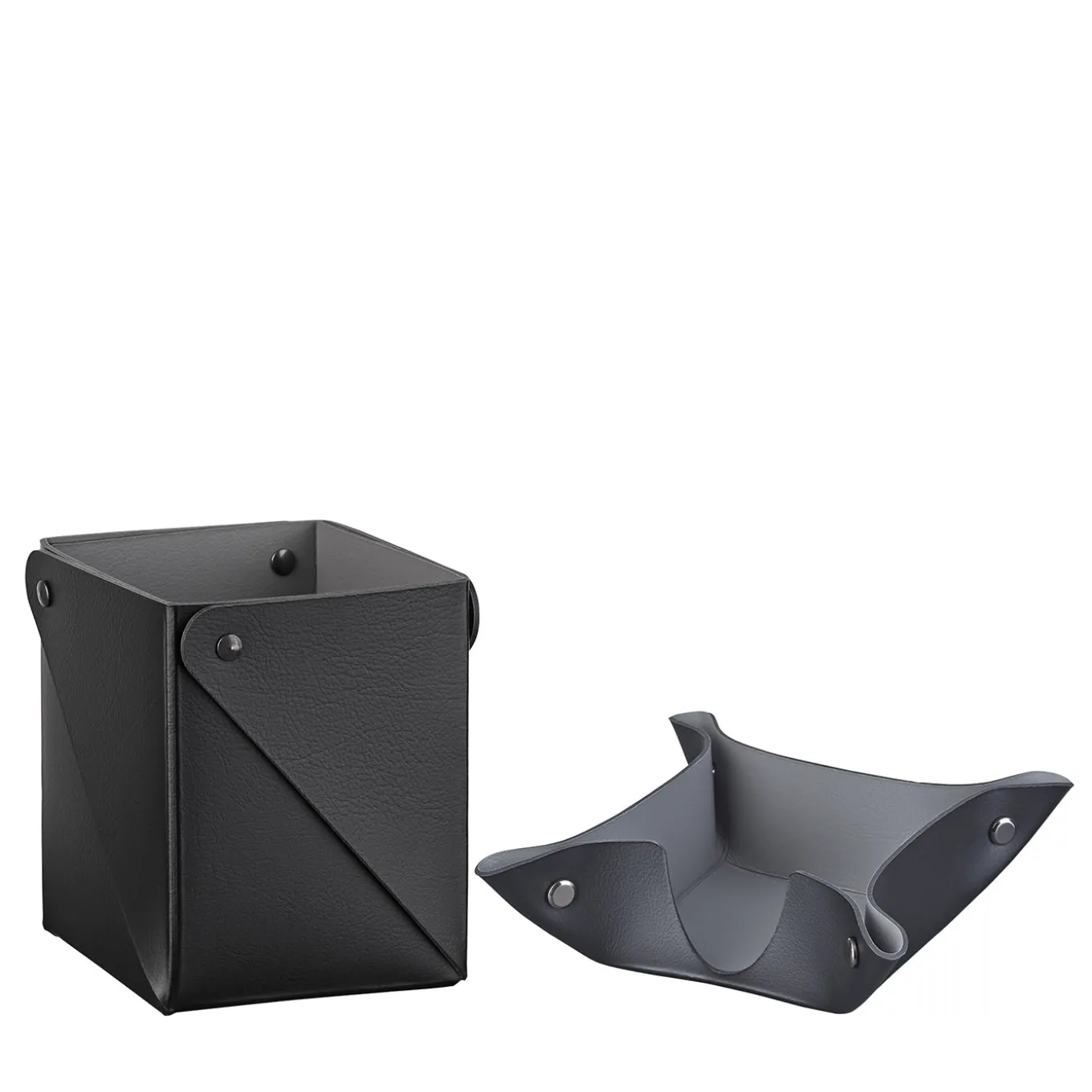 Funzionale ed elegante, questo set in pelle nera e grigia comprende un portablocco da 10×10×4 cm e una scatola Miu da 8×8×10,5 cm. Disegnato da Ekaterina Borovkova, è ideale per tenere in ordine note, penne e piccoli oggetti da scrivania, sempre a portata di mano. Il raffinato contrasto cromatico e la silhouette strutturata valorizzano qualsiasi spazio di lavoro, unendo praticità e sobria eleganza. Leggero e compatto, combina utilità e stile minimalista.