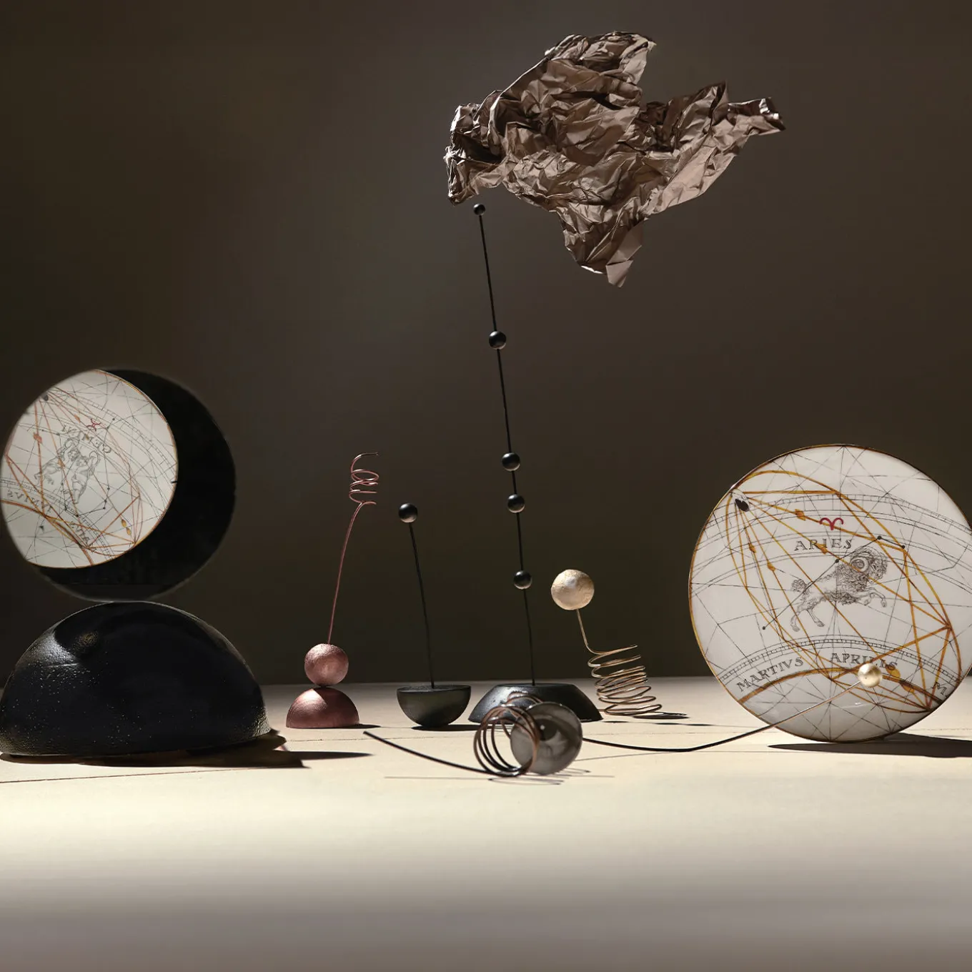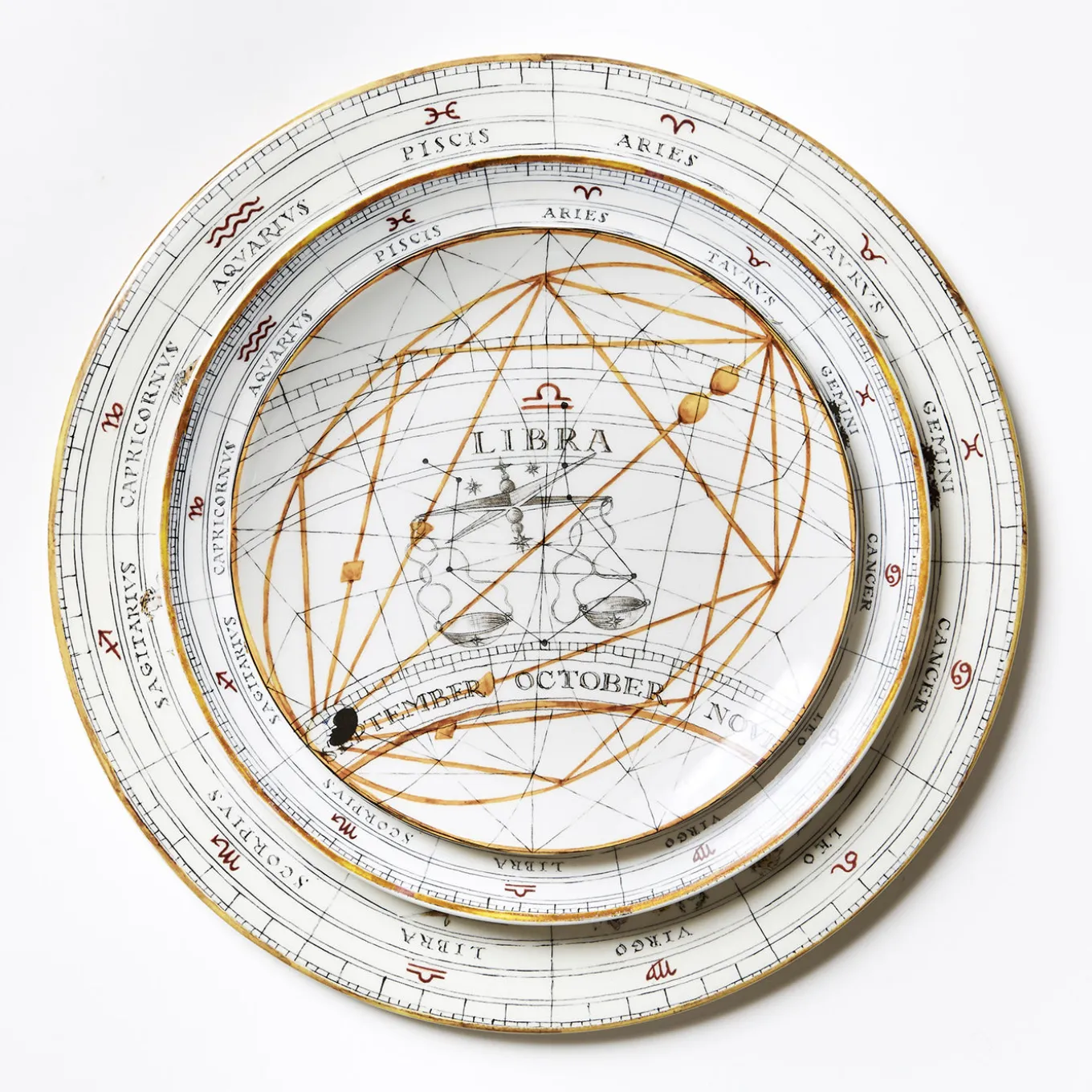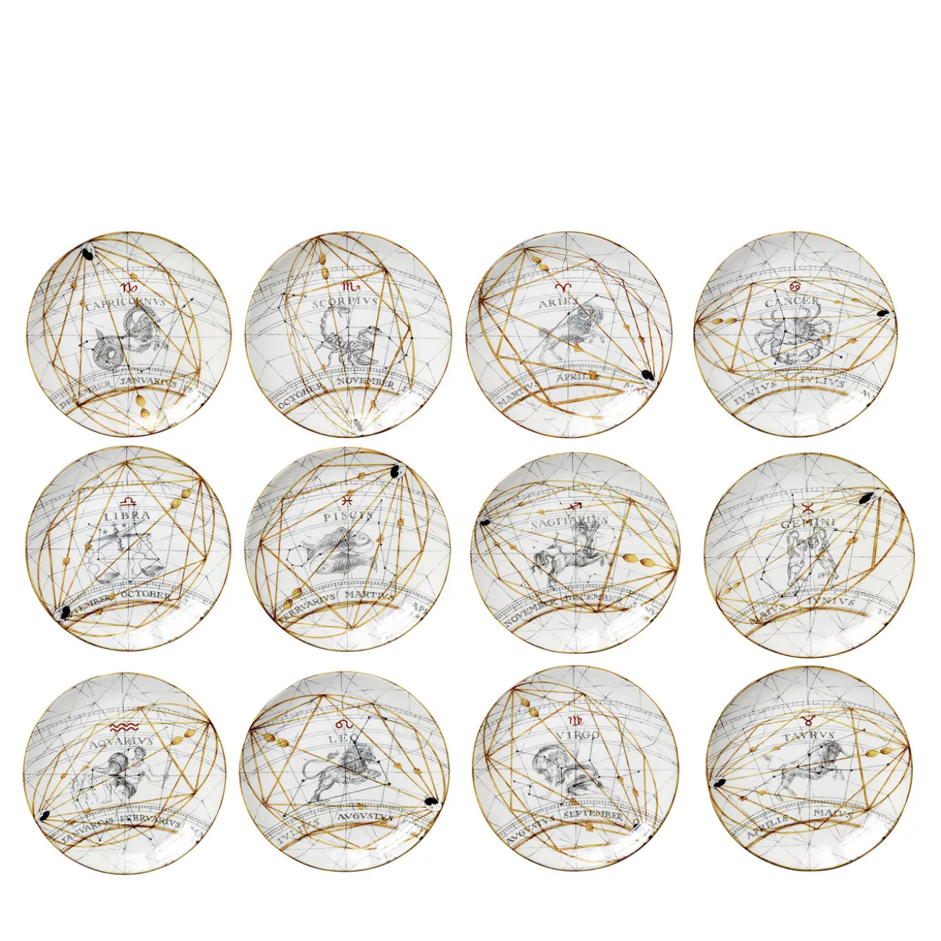 I dodici segni dello Zodiaco navigano nella geografia astrale insieme alle loro coordinate celesti, e un tredicesimo elemento li riunisce nel cerchio completo sul bordo del piatto. Impreziositi dalle trame d’oro siderali, sono un richiamo irresistibile per gli appassionati di astrologia, per chi ama le stelle, e anche per chi non legge l’oroscopo ma subisce il fascino del cielo, la notte.