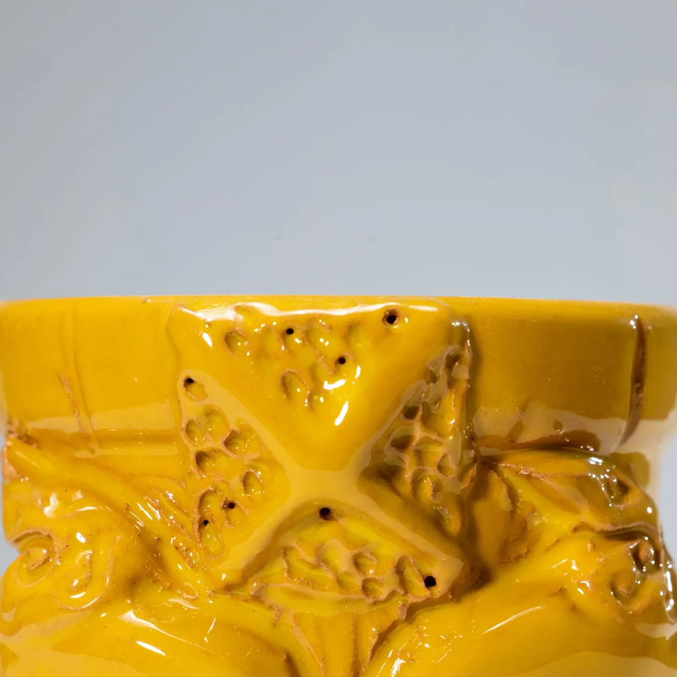 Una superba maschera di Palazzo Beneventano a Scicli, in Sicilia, viene minuziosamente ricreata sull’esterno di questa preziosa tazza in ceramica. Con una capacità di 0,4 cl, è ideale per servire cocktail in stile tiki, lasciando che l’occhio si soffermi sui suoi dettagli minuziosi ottenuti grazie a un abile processo di stampaggio manuale al tornio. Smaltata in una vibrante tonalità gialla, è un pezzo unico che celebra il barocco siciliano.