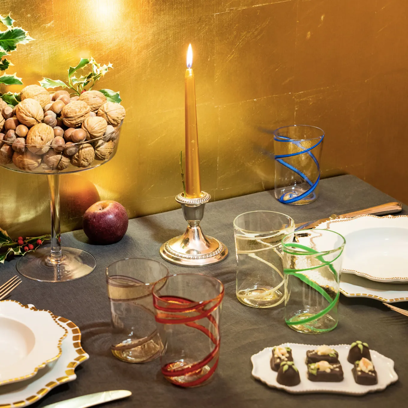 Semplice ma di grande effetto, questo vetro di Murano soffiato a bocca fa parte della collezione Vortex di bicchieri splendidamente colorati con un motivo a vortice in diverse tonalità che aggiunge eleganza e fascino a ogni pezzo. Il vetro cristallino è arricchito da una foglia d’oro 24 carati che infonde un tocco scintillante, mentre le avvolgenti volute verdi aggiungono un accento luminoso. Regalato in un set come regalo di nozze o di inaugurazione, questo bicchiere sarà un’aggiunta preziosa a qualsiasi mobile bar o tavolo da pranzo. Le piccole bolle, create dai gas durante il processo di fusione, sono un segno della natura artigianale e unica di ogni pezzo.