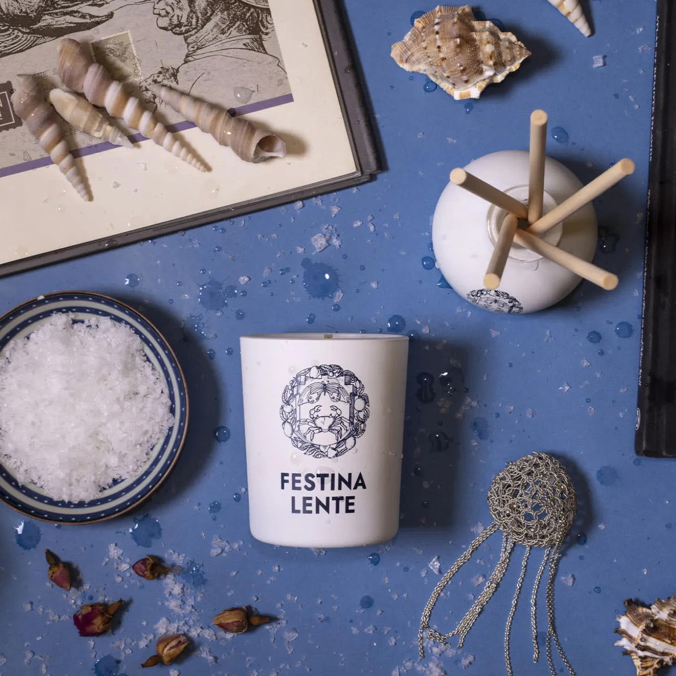 Questa candela artigianale è contenuta in un contenitore di vetro bianco con il logo Festina Lente, ispirato agli antichi simboli romani del granchio e della farfalla. Il profumo, “Hic et Nunc” (Qui e Ora), è una miscela fresca e polverosa di iris, cardamomo, zenzero, lavanda, cipresso, vetiver, muschio e fava tonka. Realizzato con pura cera di soia, stoppino di cotone e profumi vegani e cruelty-free, ha un’autonomia di 45 ore e una capacità di 200 grammi.