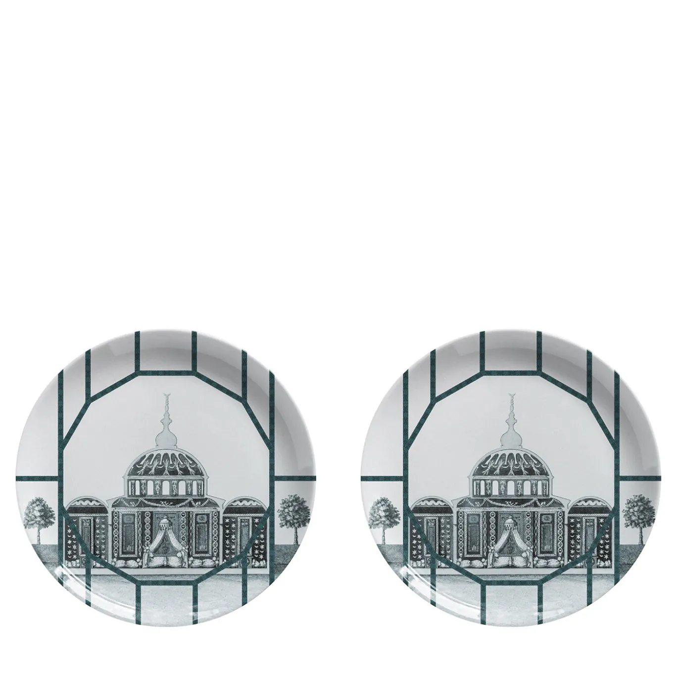 Questo set di due piatti in porcellana fa parte della collezione Topkapi, ispirata all’iconico palazzo del XV secolo che un tempo fungeva da principale residenza e centro amministrativo dei sultani ottomani. La facciata del palazzo è rappresentata in delicati toni turchesi su uno sfondo bianco, mostrando dettagli architettonici intricati. Ideali per portare raffinatezza e profondità storica sulla tavola, questi piatti possono essere utilizzati da soli o combinati con altri design della stessa serie per una presentazione visiva più stratificata.