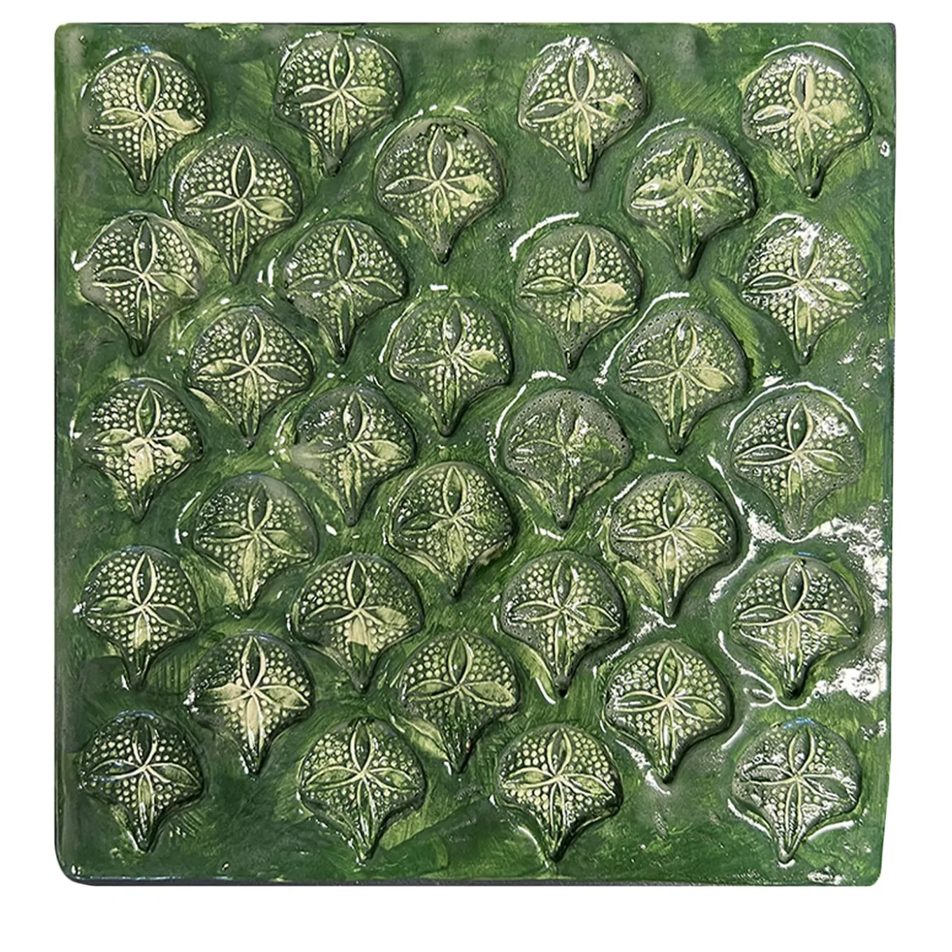 Un ipnotizzante motivo a rilievo di elementi simili a conchiglie conferisce a questa piastrella di ceramica un poetico fascino marino. Meticolosamente lavorata e decorata a mano, sfoggia un aspetto del tutto unico che non potrà mai essere riprodotto esattamente e che anzi sottolinea il prezioso valore artigianale del pezzo. Accenti floreali e puntini completano il design, proponendo il pezzo anche come romantico sottopentola per tavole dallo stile fresco e contemporaneo.