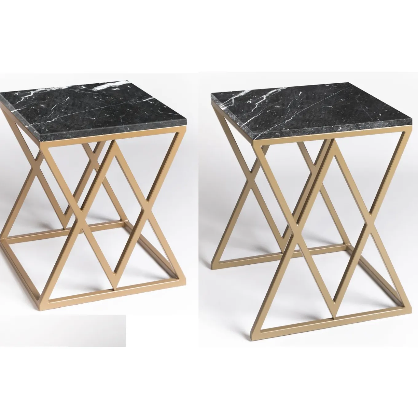 Una squisita vetrina di artigianato in due design scultorei dal forte fascino geometrico, questo set di due tavolini da caffè sarà un’aggiunta elegante e singolare in un interno contemporaneo o minimalista. Il piano quadrato in marmo nero Marquina è caratterizzato da una base in ferro laccato oro. Questo set è composto da un tavolino corto e uno alto, rispettivamente di 45x45x50 cm e 50x50x60 cm, ed è disponibile in altre finiture metalliche o in altri tipi di marmo.