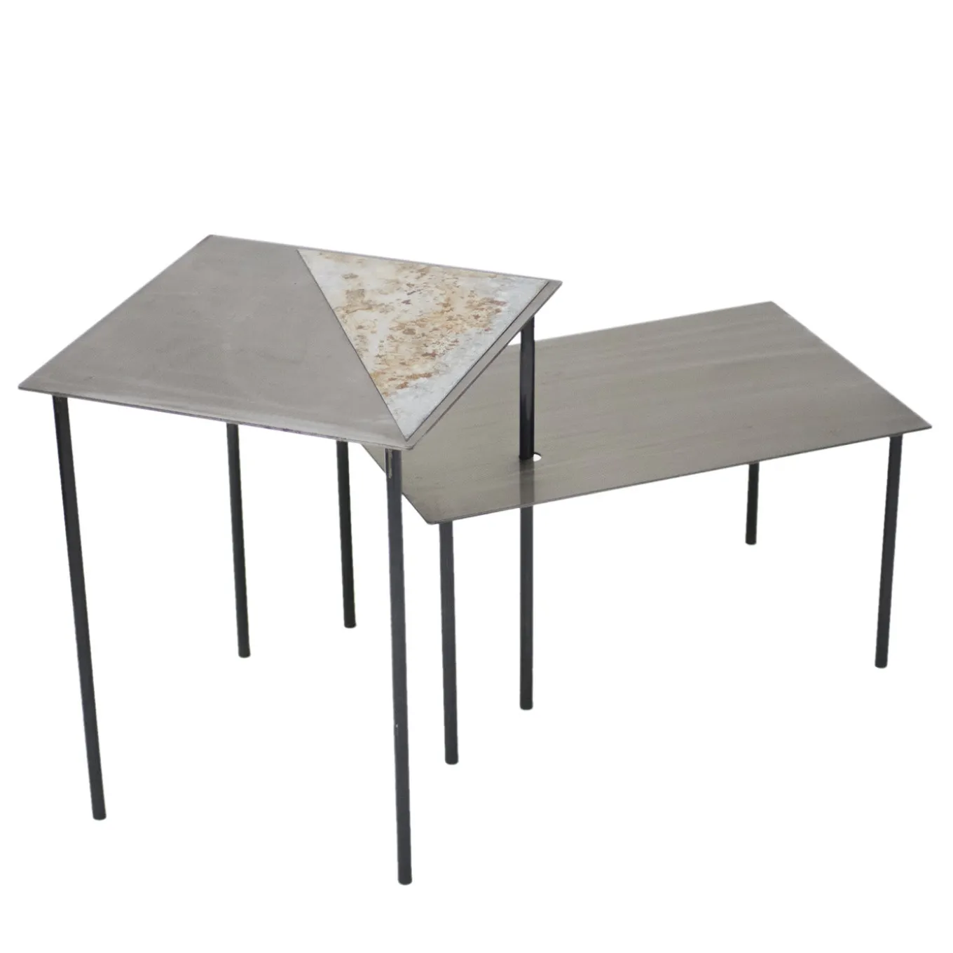 Questo set di due tavolini è un design minimale e sofisticato, dall’allure post-industriale. Utilizzabile come elemento separato o insieme in un insieme scultoreo di grande impatto visivo, ogni pezzo è composto da una struttura in ferro grezzo con gambe dritte e robuste, e da piani sottili in diverse forme geometriche ravvivate dall’aggiunta di inserti in diversi materiali. Il tavolo basso misura 52,5 x 36,5 x H 28 cm, il tavolo alto 38 x 35 x H 45 cm.