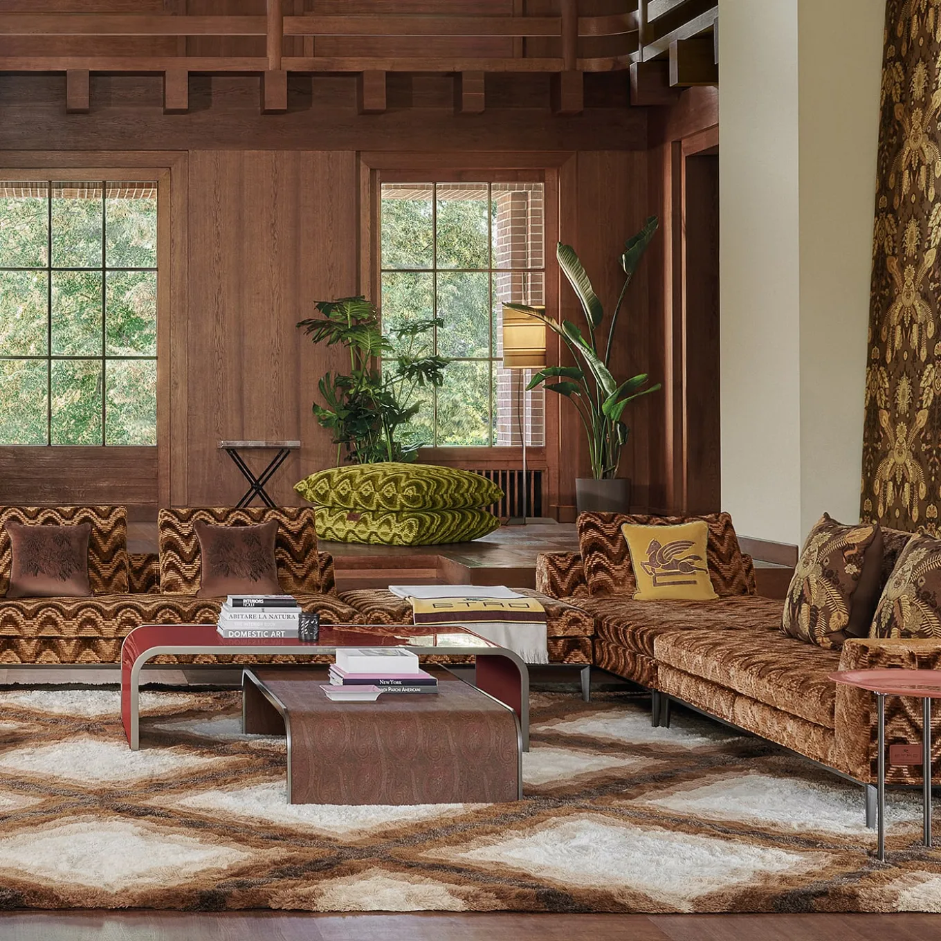 Design essenziale e fascino vintage per i tavolini Fly Over. Ispirati al mood anni ’50 dei mobili della designer milanese Gabriella Crespi, sono disponibili in varie dimensioni. I profili in metallo con finitura bronzata ne esaltano ulteriormente le linee, accentuandone l’estetica minimalista. Tavolo basso con struttura in legno Multiflex curvato e MDF rivestito in tessuto spalmato Arnica. Profilo in laminato ad alta pressione con finitura Dusk Bronze con logo Etro (1 lato).