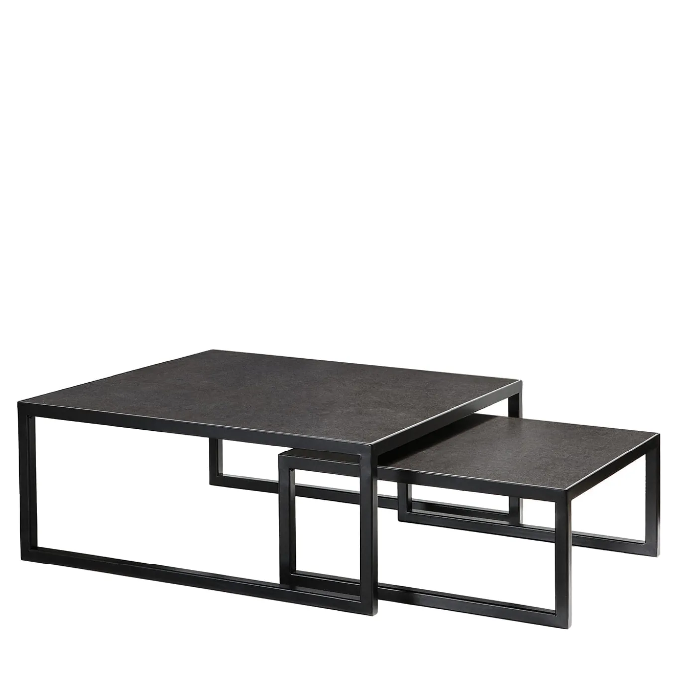Un set di tavolini dalle linee geometriche, interamente realizzato con piastrelle di ceramica. Un set sorprendente per un look regolare a incastro che arreda le case contemporanee. Qui la versione nera: disponibile anche con piano beige.