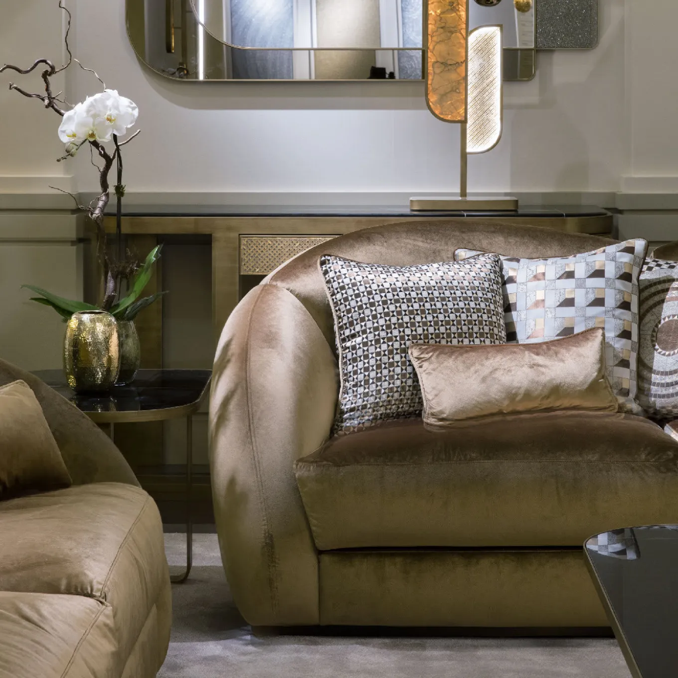 Moderno ed elegante, questo divano modulare è composto da due unità angolari separate, ciascuna dotata di un unico bracciolo, che si incurva elegantemente per formare lo schienale. Costruito su una struttura in legno massiccio e compensato con base a zoccolo, gli elementi imbottiti sono in poliuretano a densità differenziata. I cuscini sciolti sono rivestiti in piuma d’oca per un’esperienza ancora più soffice. Ogni unità misura 103 x 110 x H89 cm.