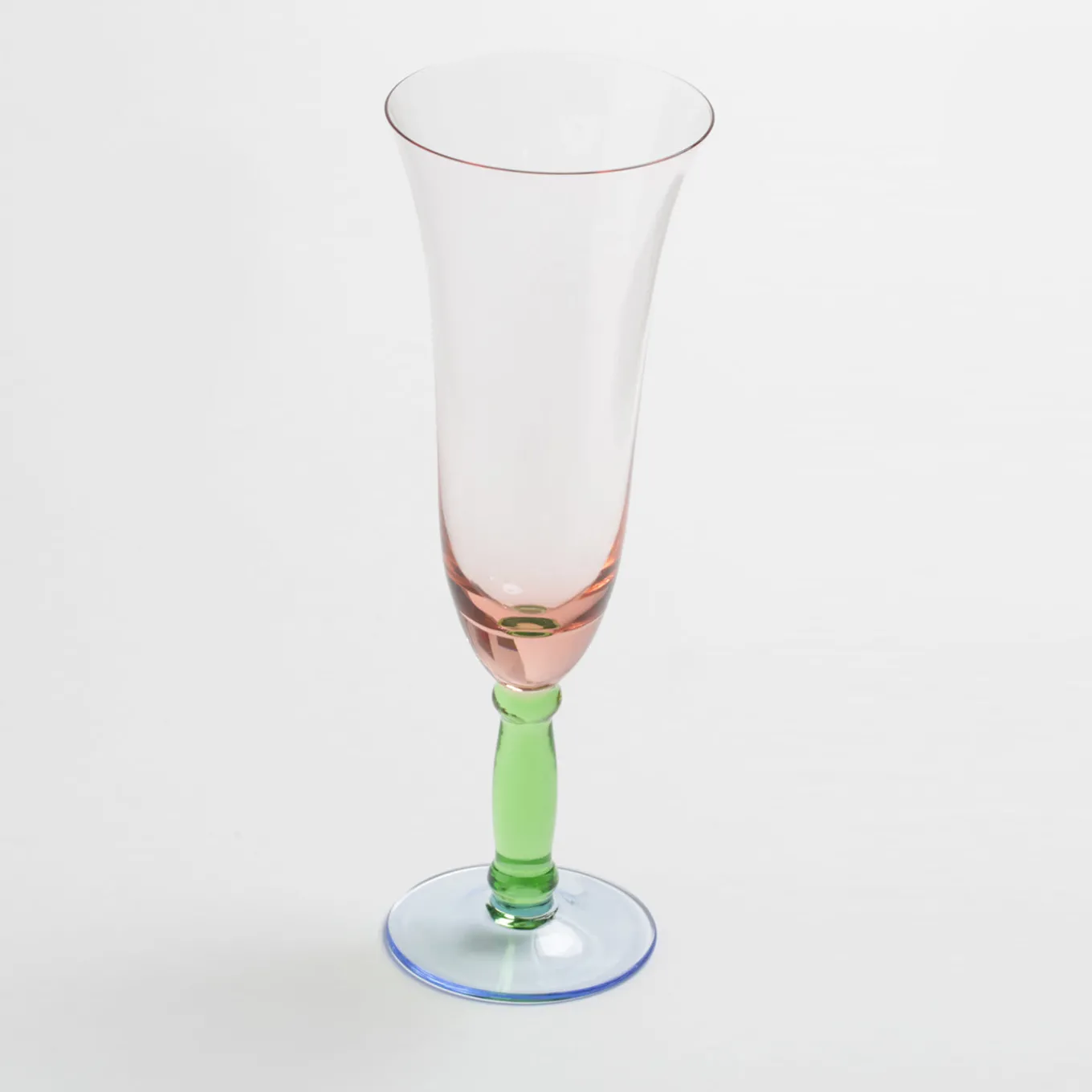 Questo raffinato set è composto da due bicchieri da liquore (Ø 6 cm, H 11 cm), due bicchieri da vino (Ø 8,5 cm, H 17 cm) e due flute (Ø 7,5 cm, H 21 cm). Ogni bicchiere è caratterizzato da linee eleganti e colori vivaci: rosa sul corpo, verde sul gambo e blu chiaro sulla base.