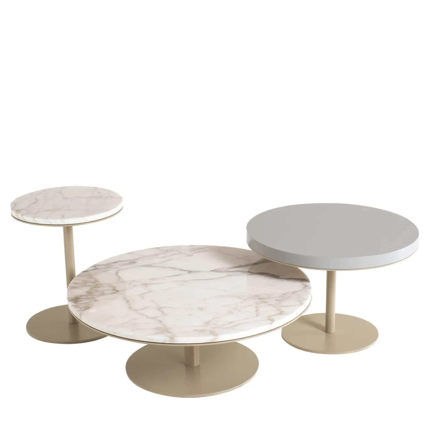 Create uno spazio originale per servire bevande e snack in un’area lounge contemporanea con questo set di tre tavoli da portata rotondi. Completamente personalizzabili, i tavoli illustrati presentano una base in oro opaco, due piani in marmo e un piano in legno laccato. I tavoli fanno parte di una collezione completa di pezzi ispirati alla geometria.
