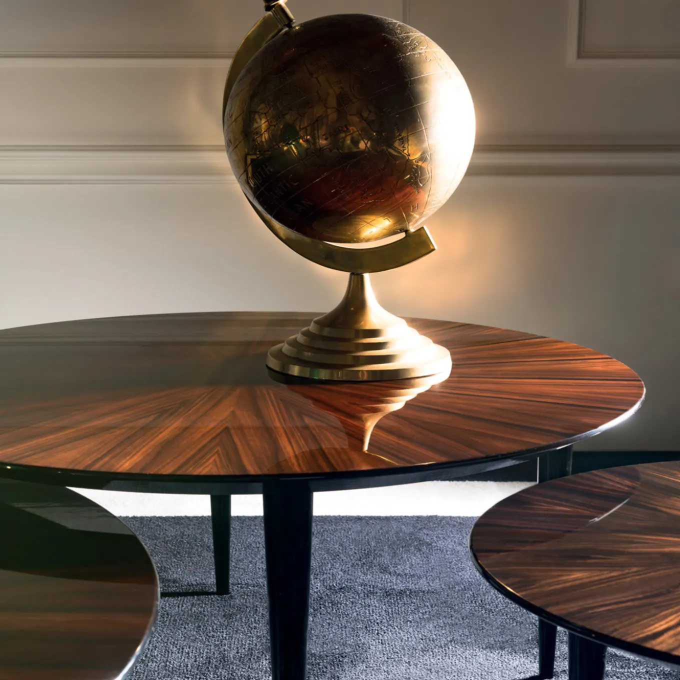 Parte della serie Pierrot, questo trio di tavolini vanta una squisita lavorazione artigianale e l’utilizzo del pregiato ebano Macassar. Il design di ogni pezzo, ispirato al fascino romantico della celebre maschera francese da cui prende spunto, è una delicata combinazione di piano rotondo e gambe affusolate, intercambiabili e decorate con lacca nera lucida. La decorazione a raggiera sui piani è eseguita con maestria. Le misure dei pezzi sono: Ø80 x H35 cm, Ø56 x H40 cm e Ø 56 x H45 cm.