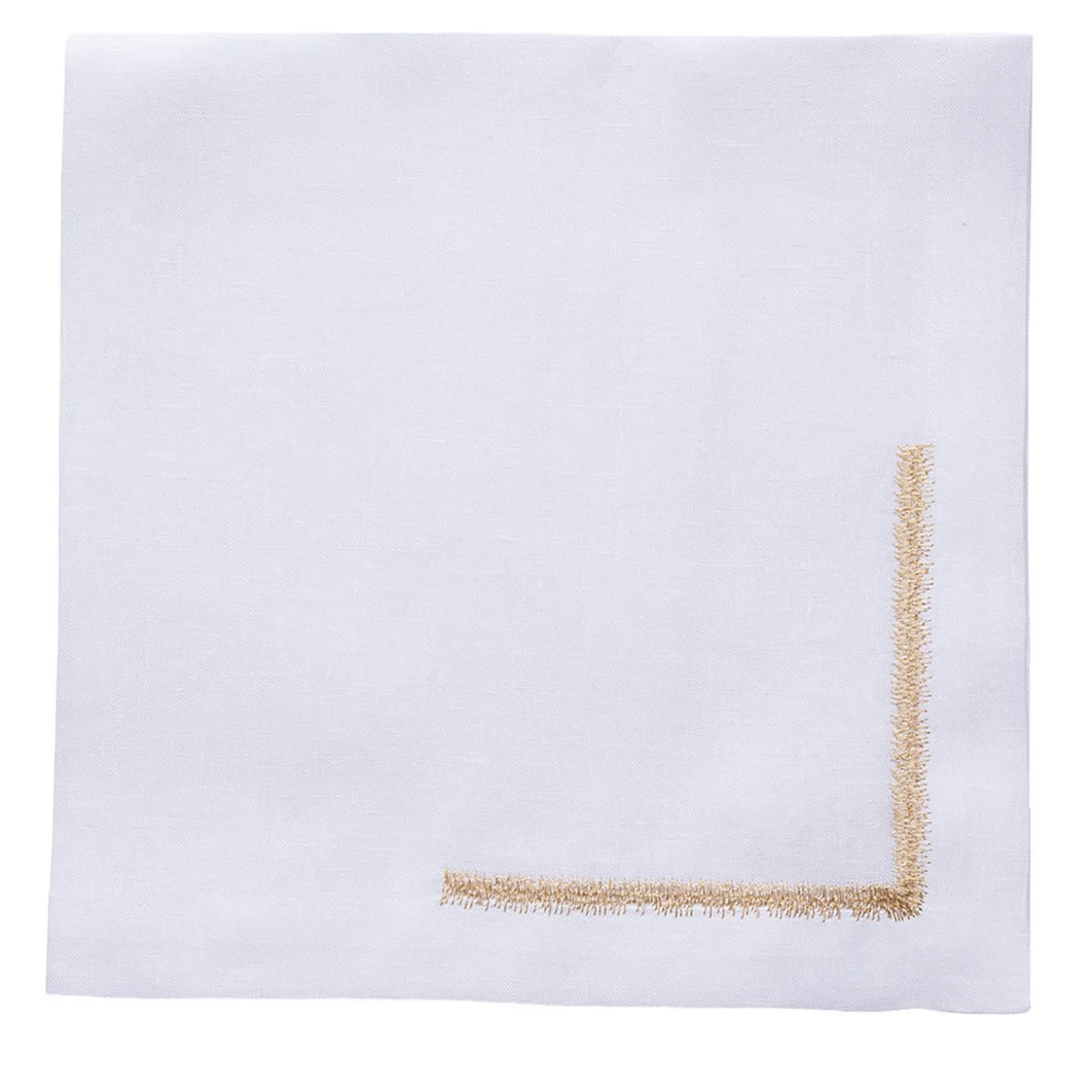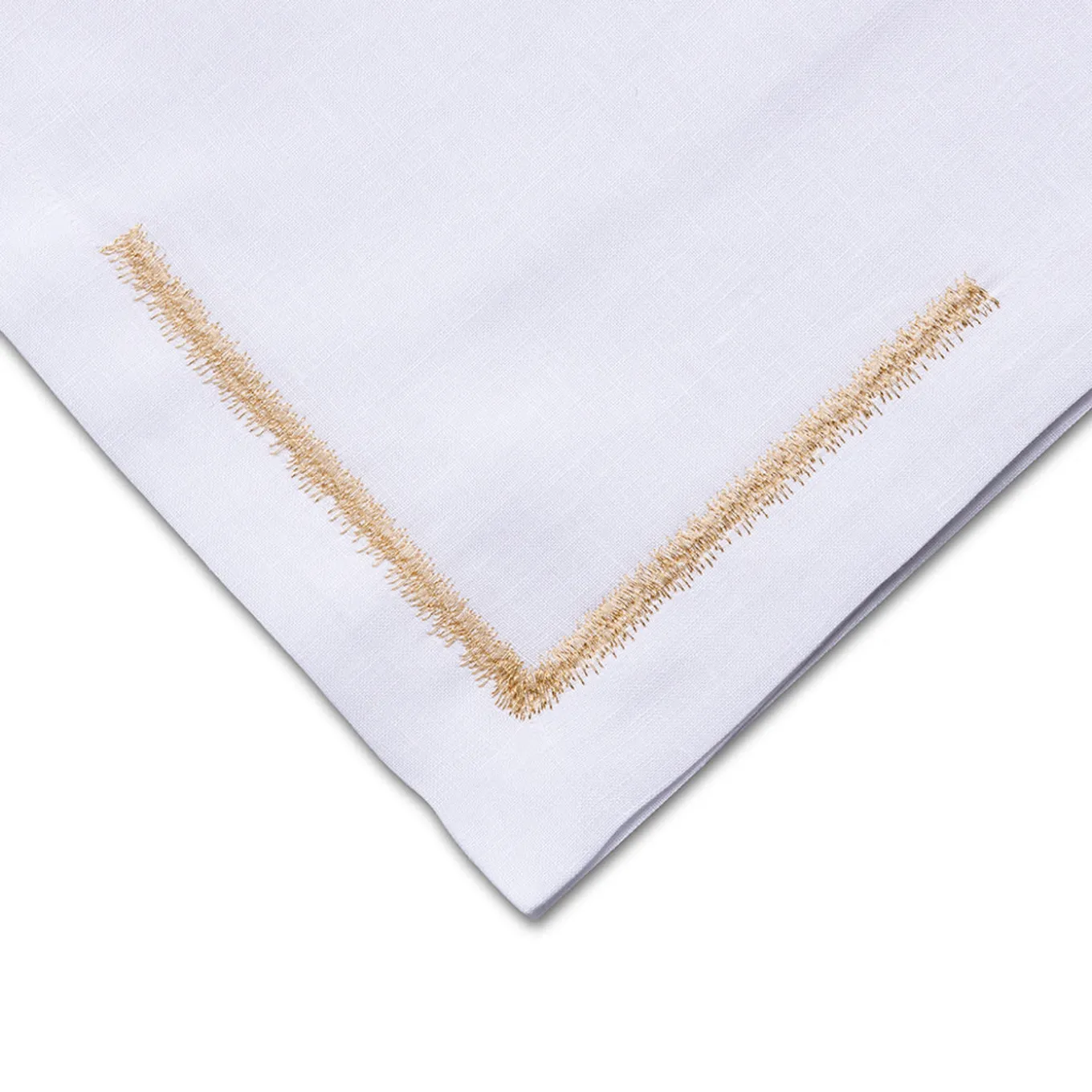 Questo set di quattro tovaglioli, dall’elegante semplicità, sarà un’aggiunta preziosa alle tavole da pranzo sia in stile tradizionale che moderno. Realizzato magistralmente a mano in lino bianco di prima qualità, ogni pezzo è arricchito da meravigliosi ricami dorati fatti a mano, che aggiungono un carattere luminoso e sontuoso al design.