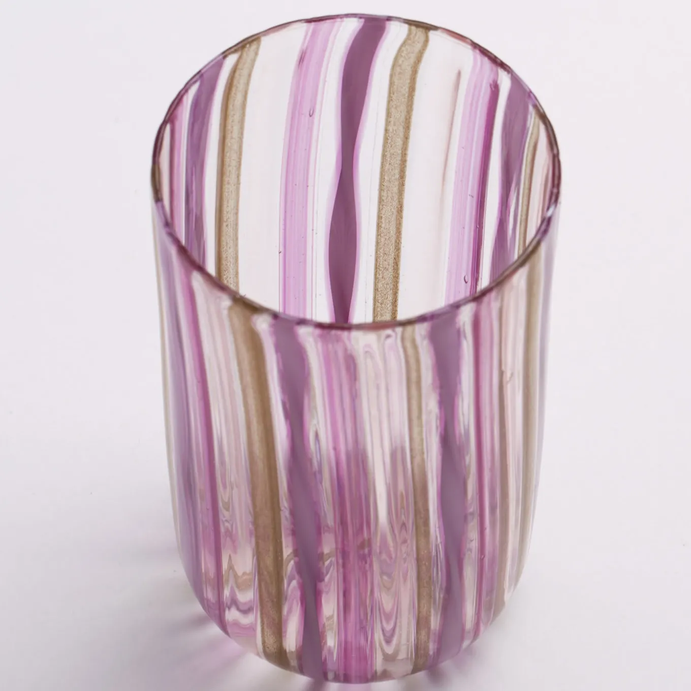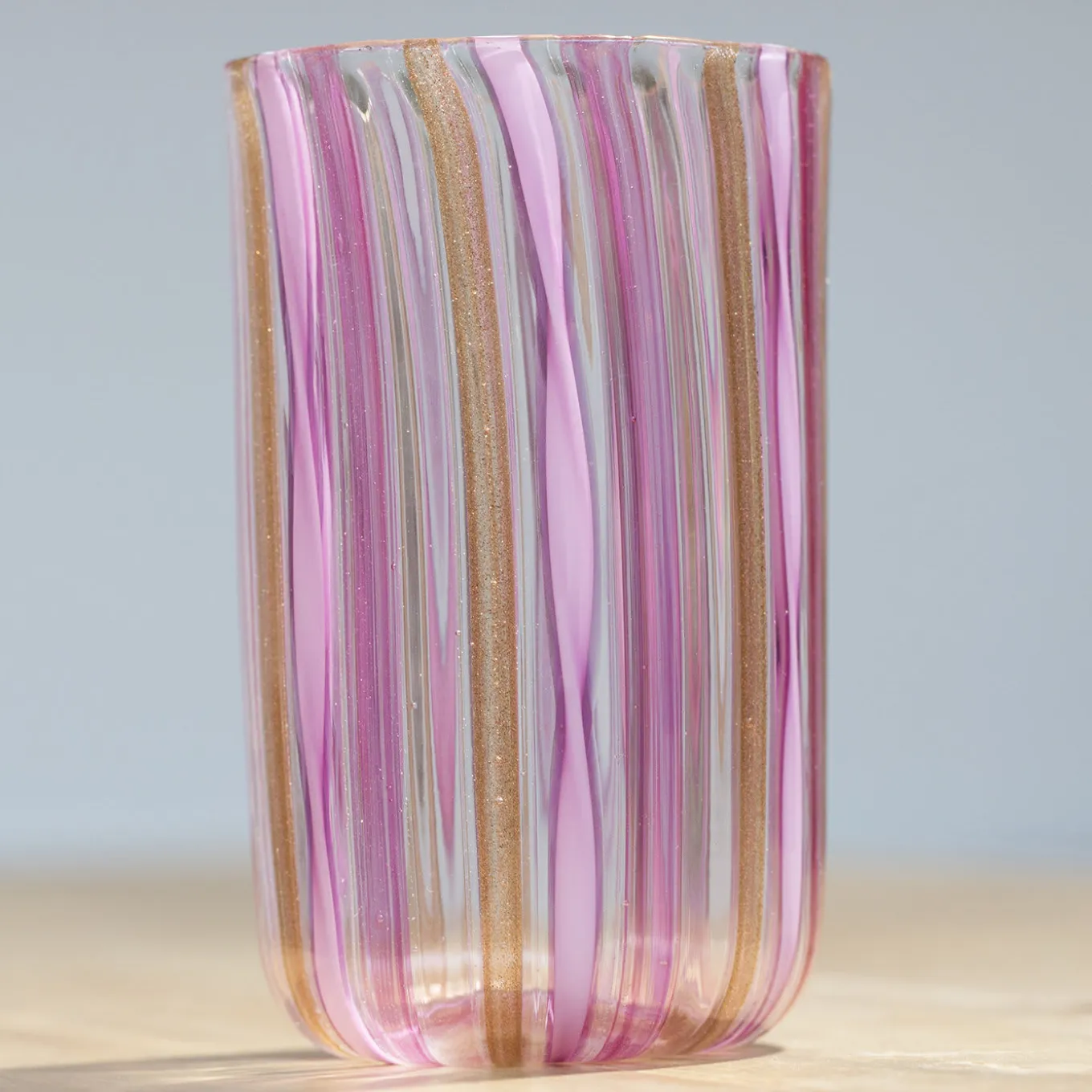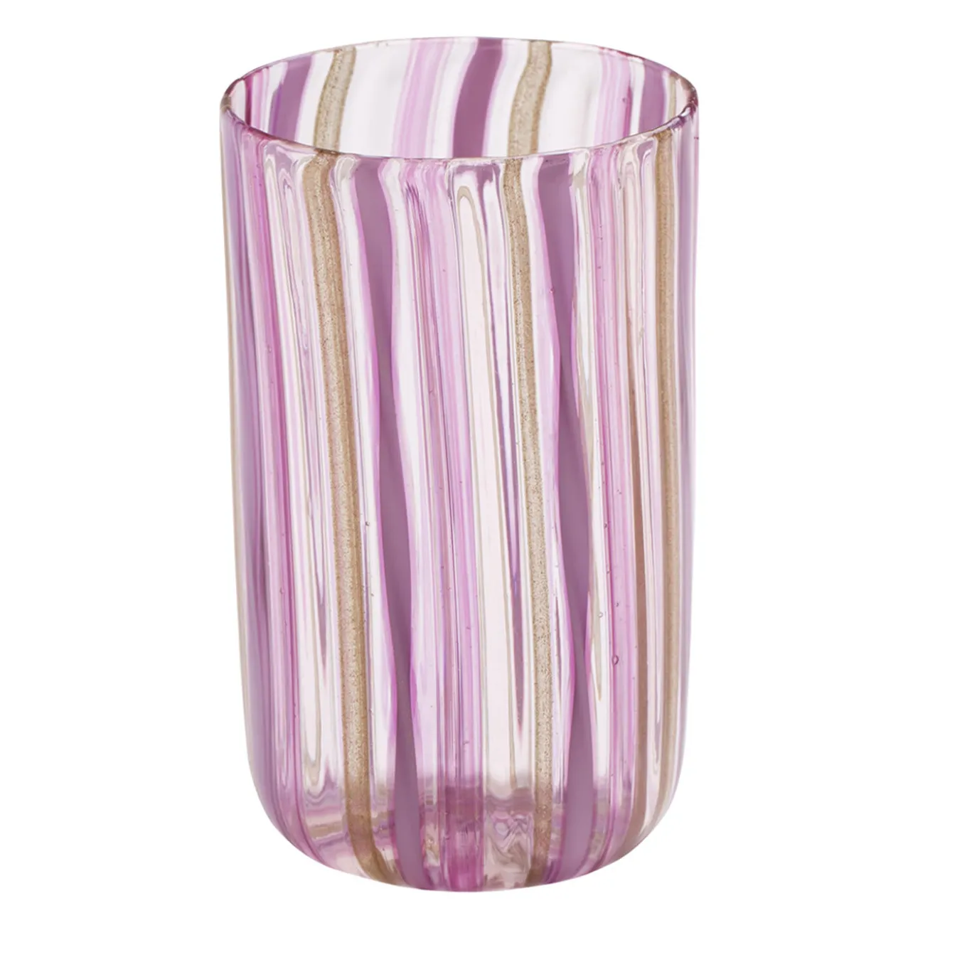Set di 6 bicchieri di Murano in filigrana realizzati con la tecnica “a Canna”, in cui canne di vetro colorato vengono fuse in una base di vetro trasparente. Questo bellissimo set rosa e oro comprende 6 bicchieri interamente realizzati a mano sull’isola veneziana di Murano dai maestri soffiatori de La Fornasotta. I bicchieri in filigrana sono solitamente considerati i più preziosi tra tutti i bicchieri di Murano.
