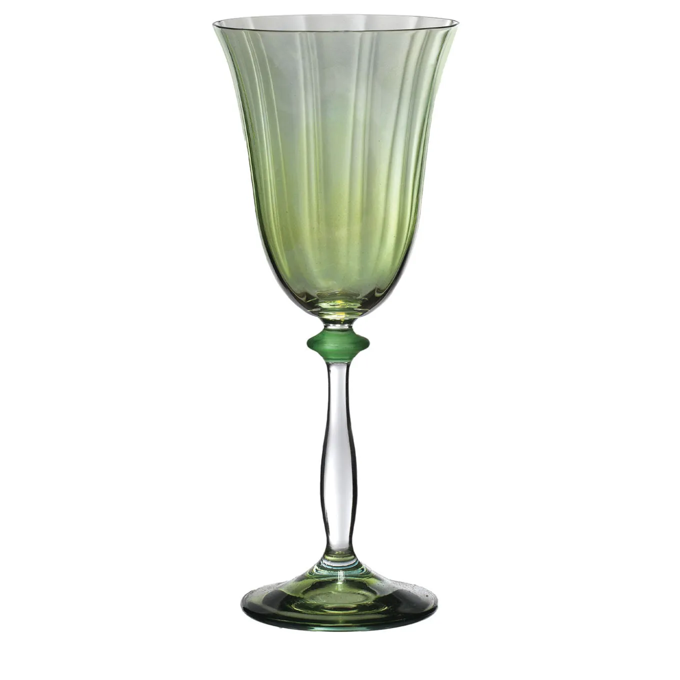 Set di 6 calici da vino Primula in vetro soffiato verde, pensati per il vino rosso, con una raffinata finitura ottica e dettagli decorati a mano. Ogni calice presenta una coppa scanalata con una delicata tonalità di verde, sorretta da uno stelo sottile e trasparente con un elegante accento verde alla base della coppa. Ideali per aggiungere un tocco artistico e raffinato a qualsiasi contesto di degustazione.