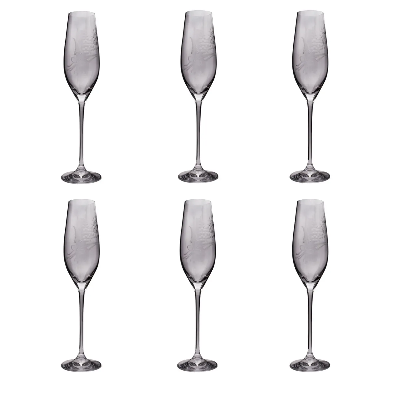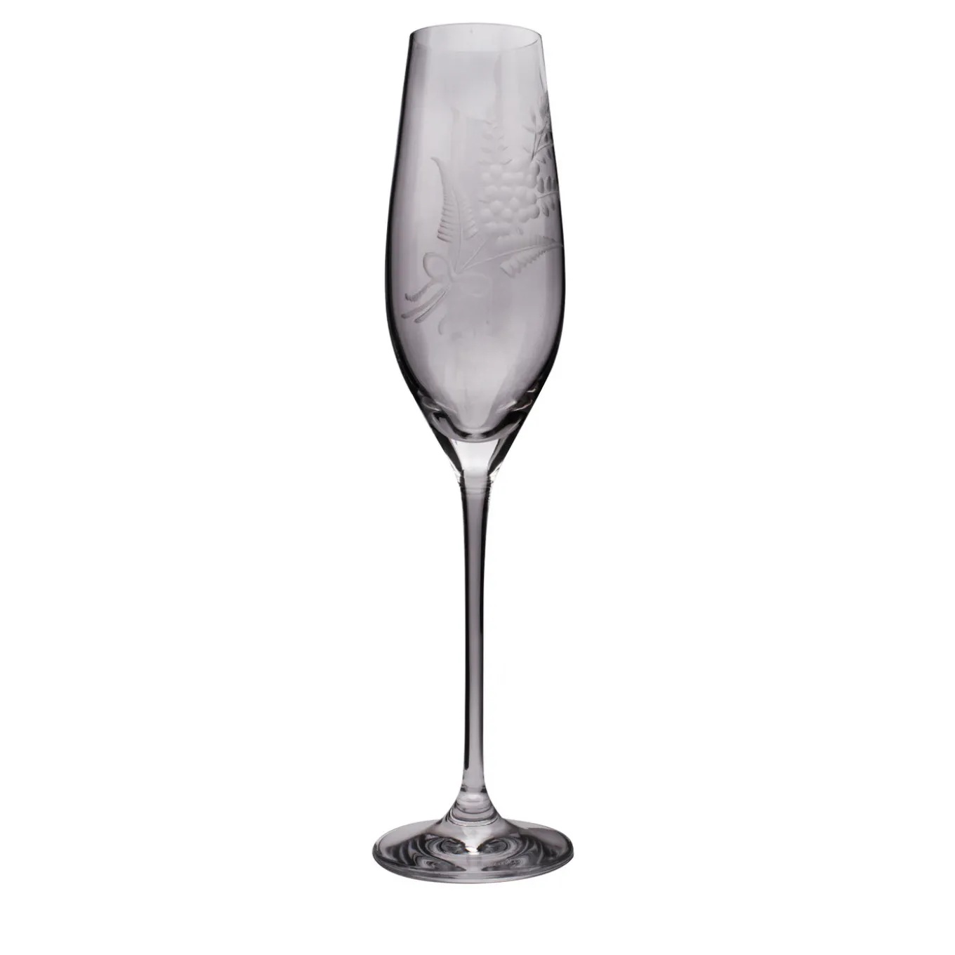 Questo squisito set di flute da champagne vanta una splendida decorazione chiamata “ramo dell’amicizia”. Un motivo tradizionale della cittadina di Altare, in Liguria, dove lavora la maestra artigiana Vanessa Cavallaro. Questo motivo floreale, reso in modo squisito nei dettagli e nella consistenza, raffigura un mazzo di fiori di nontiscordardime. Questa affascinante decorazione è stata incisa sul vetro con la rotella e abbellisce la coppa allungata del flute, che ha una capacità di 210 ml.