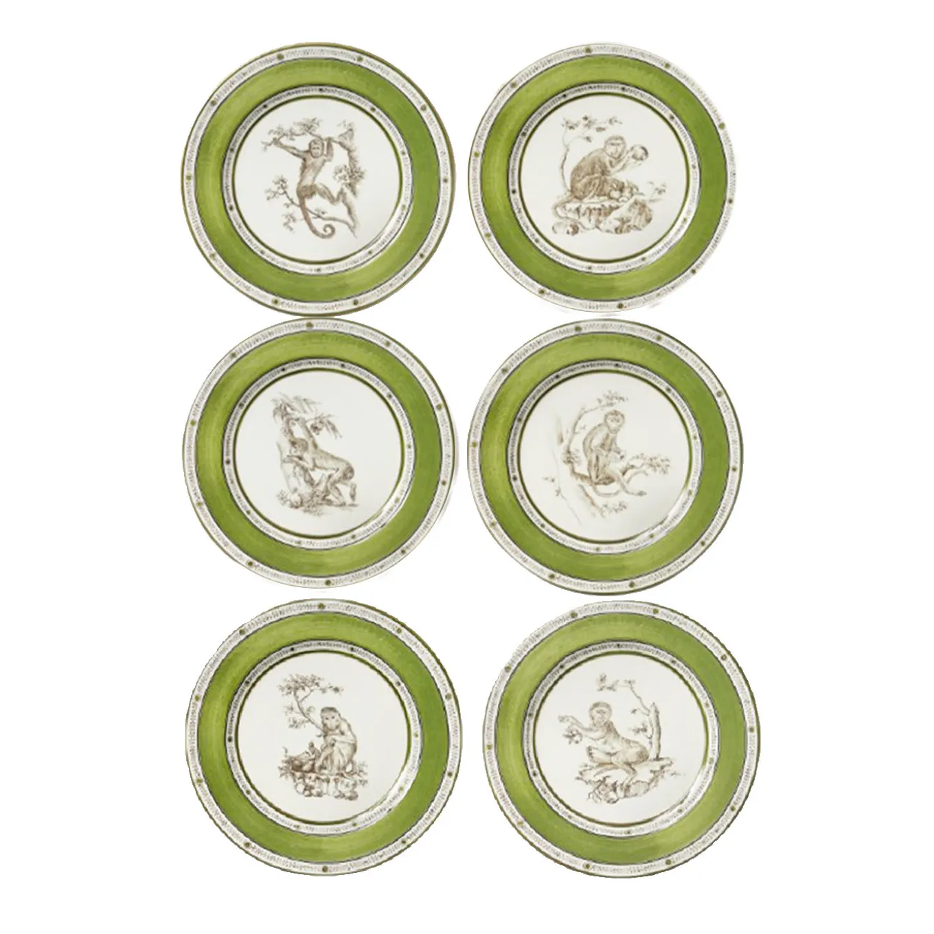 Uno straordinario set di dodici piatti, ognuno contraddistinto da un motivo differente: dodici scimmie, circondate da piante e frutta, sono intente a giocare, arrampicarsi, nascondersi, dando vita a una vera e propria composizione dinamica che attraversa l’intera collezione. Un tema ludico reso importante da un’ampia bordatura verde e una preziosa decorazione.