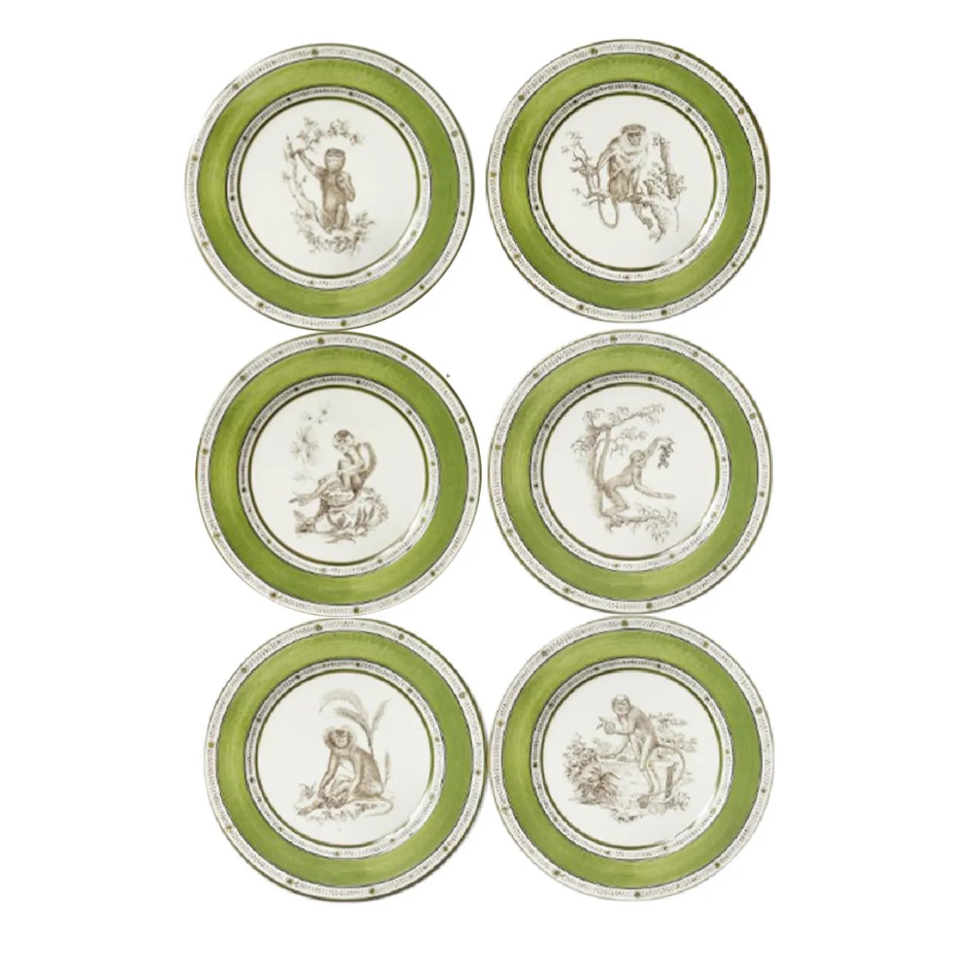 Uno straordinario set di dodici piatti, ognuno contraddistinto da un motivo differente: dodici scimmie, circondate da piante e frutta, sono intente a giocare, arrampicarsi, nascondersi, dando vita a una vera e propria composizione dinamica che attraversa l’intera collezione. Un tema ludico reso importante da un’ampia bordatura verde e una preziosa decorazione.