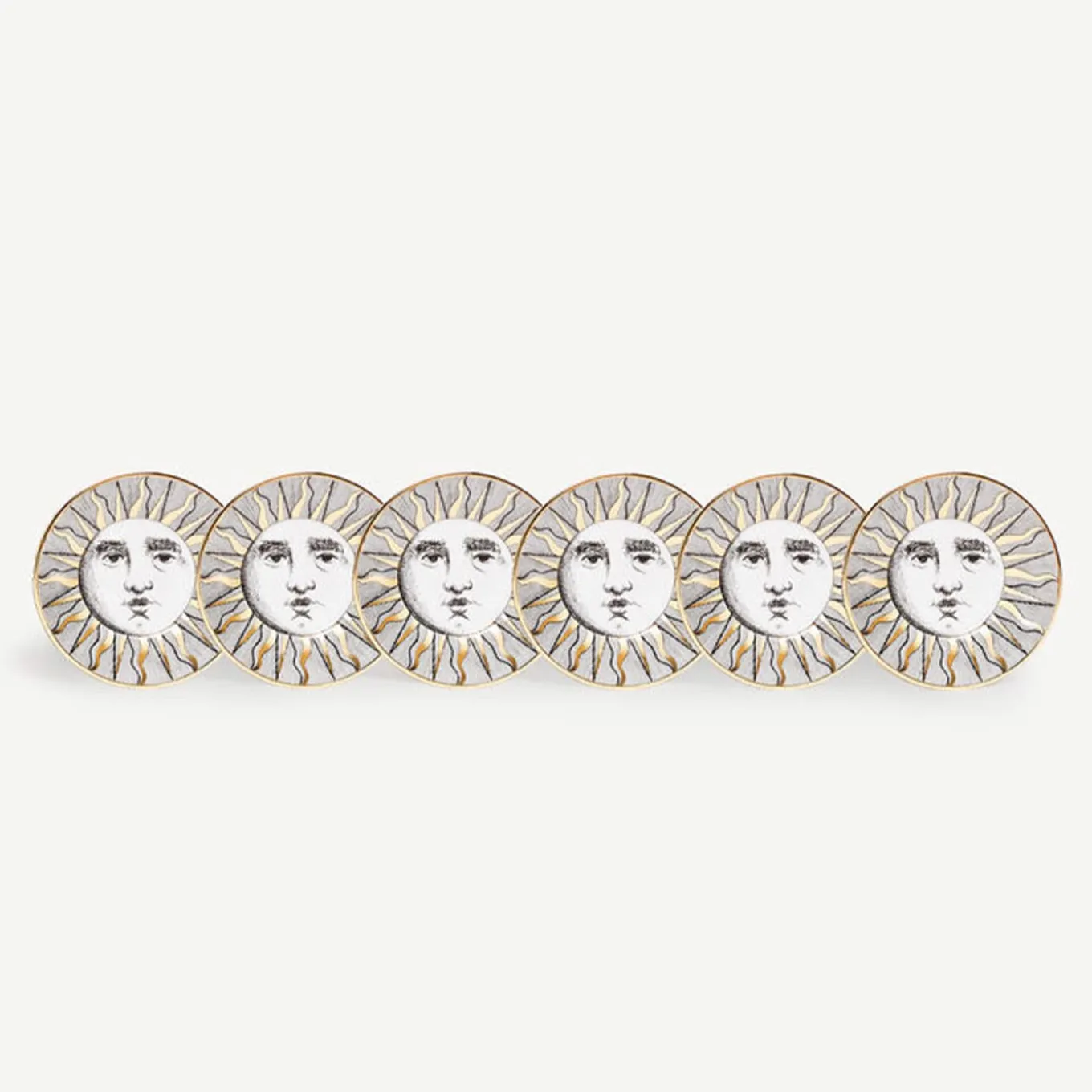 Il sole occupa un posto privilegiato nell’immaginario di Fornasetti ed è uno dei principali temi decorativi dell’Atelier: qui è il protagonista di questo set di tazze da tè in porcellana decorata a mano con accenti dorati. Eventuali piccole discrepanze tra creazioni simili sono il risultato di una lavorazione artigianale e attestano l’unicità di ogni prodotto.