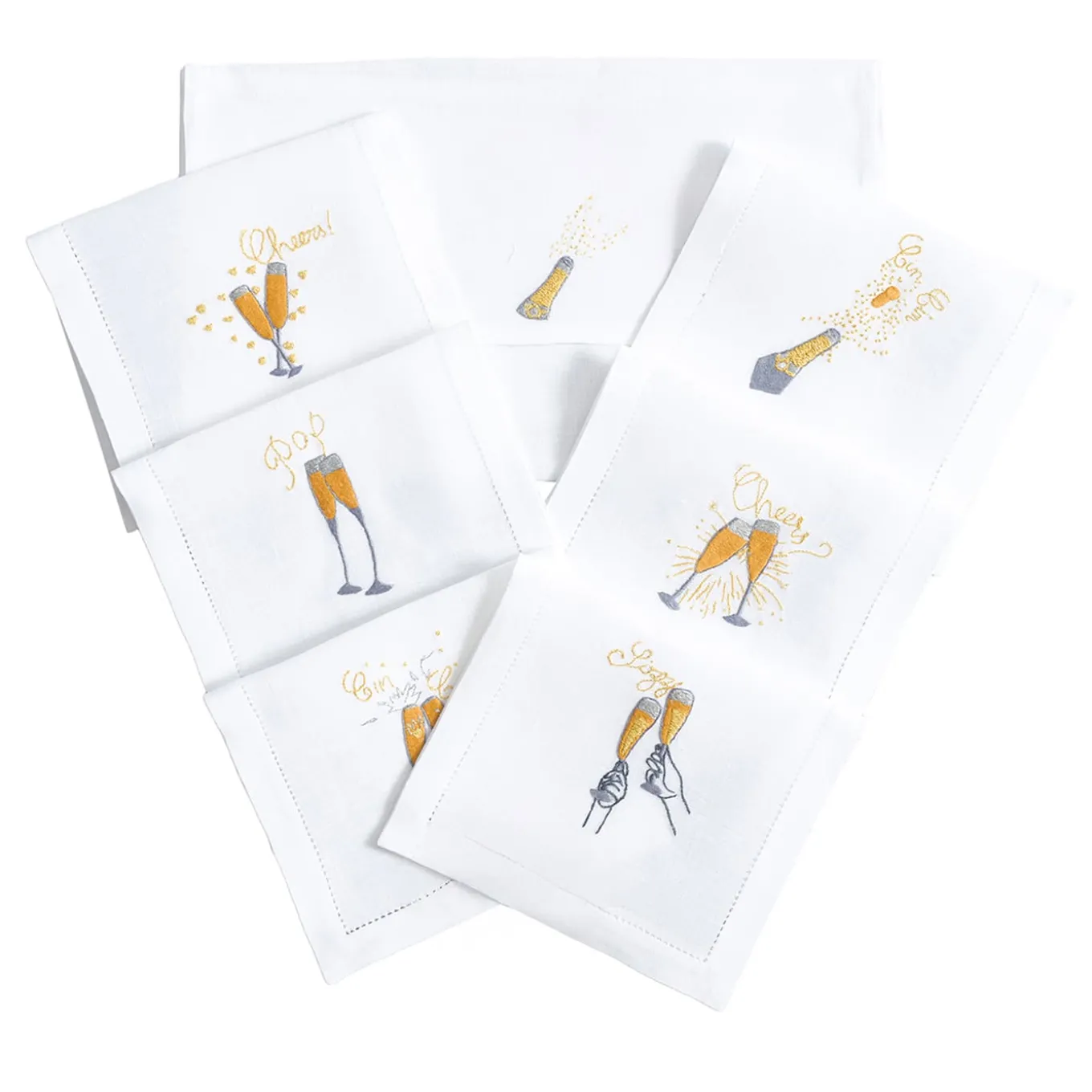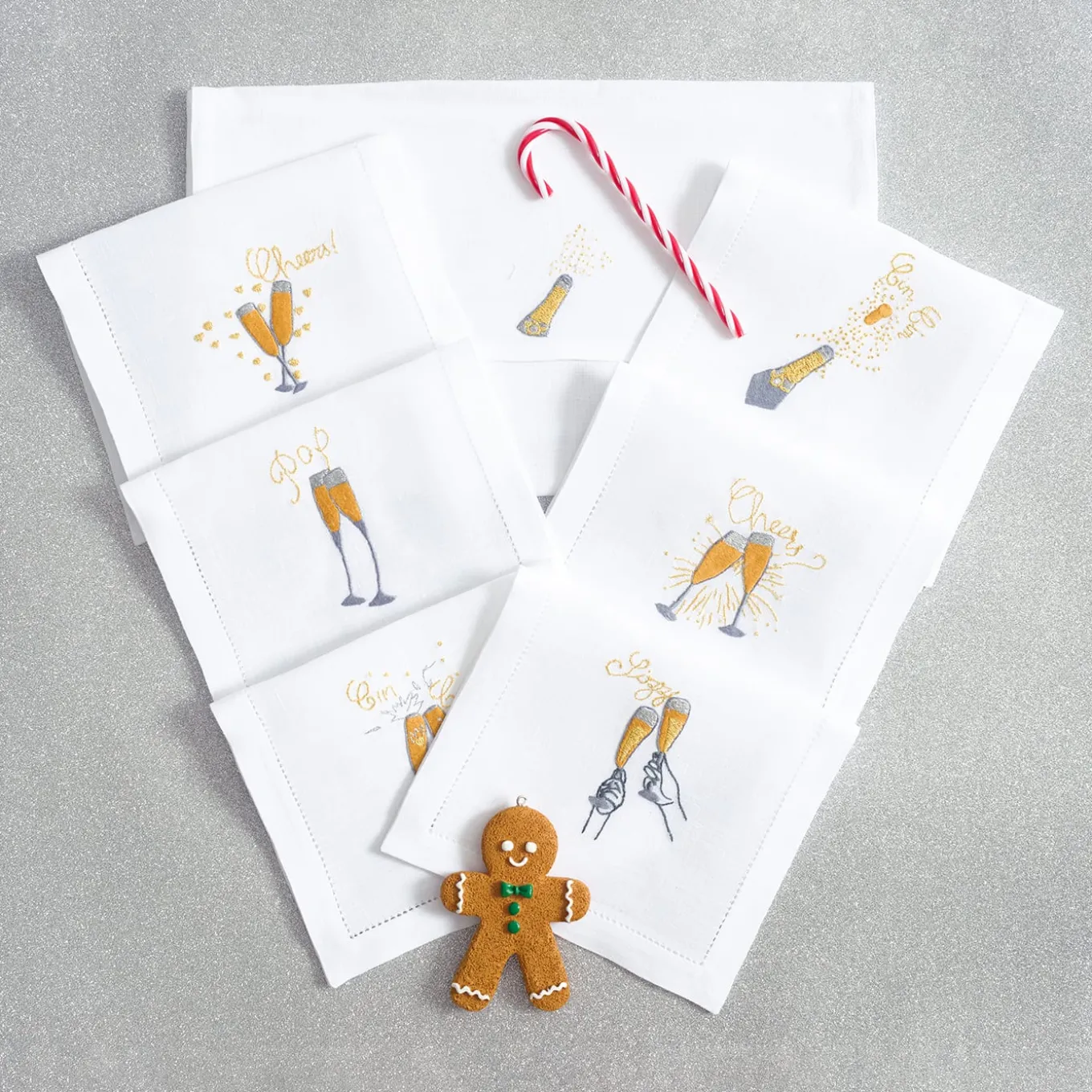 Set di tovagliette rettangolari per bevande ricamate a mano, comprendente 6 pezzi e un astuccio coordinato. Ogni tovaglietta è realizzata in lussuoso lino italiano. Il design dello champagne è caratterizzato da intricati ricami di flauti e motivi di bollicine, che aggiungono un tocco elegante e celebrativo alla tavola. Perfette per le feste o per le occasioni speciali, queste tovagliette riflettono la dedizione di Maison Alia alla qualità e alla raffinatezza, elevando ogni esperienza culinaria con un pizzico di glamour.