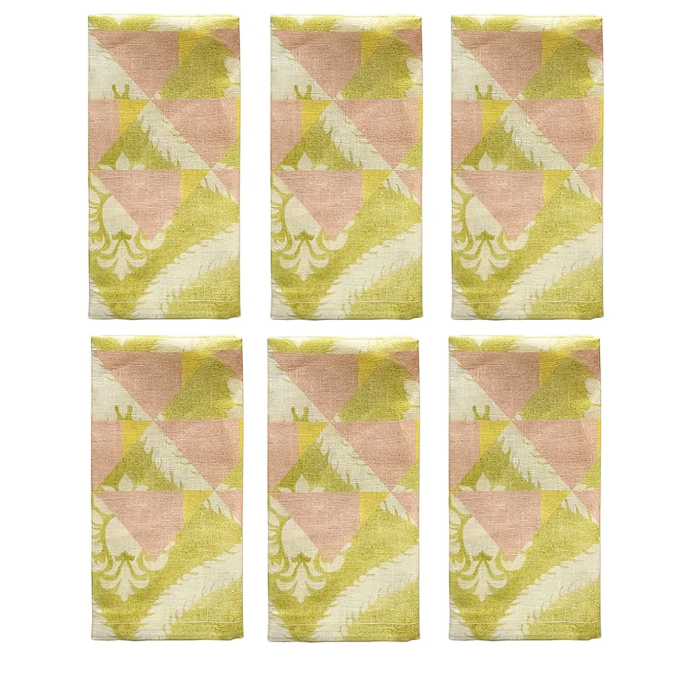 Reinterpretazione contemporanea di opulenti motivi damascati, questo set di sei tovaglioli in voile di lino e cotone, realizzati su ordinazione, è stato originariamente dipinto a mano con toni rosa cipria e pistacchio ravvivati da accenti gialli. Stampati con una tecnica ecologica a base d’acqua, la loro decorazione può essere rafforzata richiedendo una tovaglia o un rivestimento coordinato della collezione Ornamental Crush.