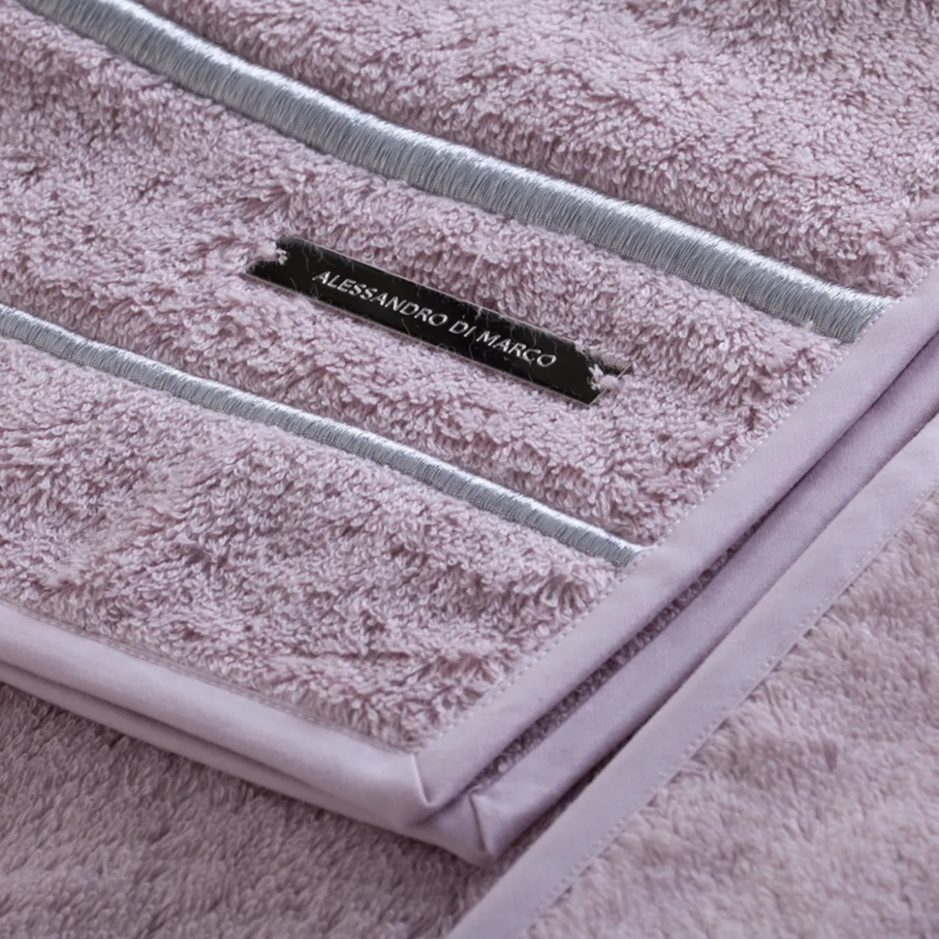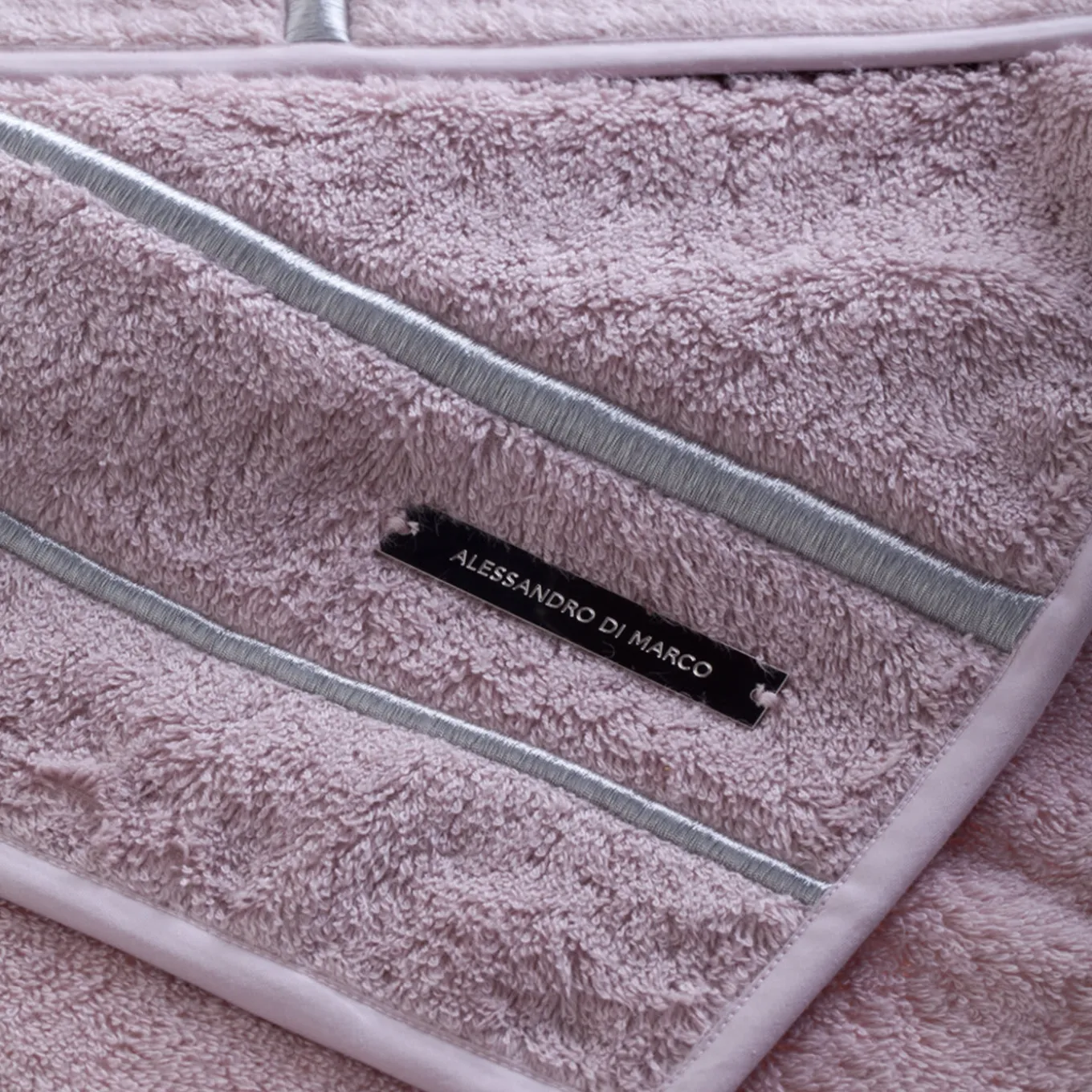 Questo elegante set di asciugamani da bagno è composto da 2 asciugamani di taglia piccola, 2 di taglia media e un asciugamano di taglia grande di colore rosa cipria. 100% morbido cotone egiziano con bordi cuciti a mano, impreziositi da due nastri argentati metallizzati e ricamati con filato Lurex. La targhetta del logo in metallo è stata impressa e presenta una finitura in palladio.