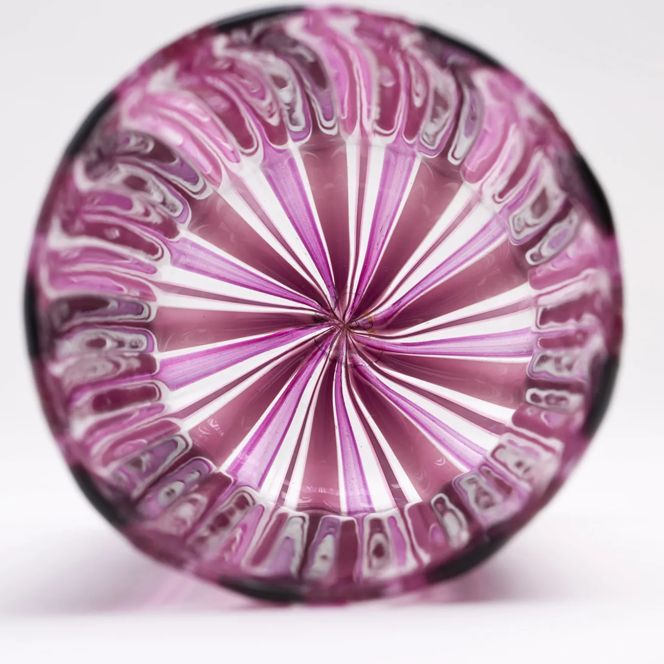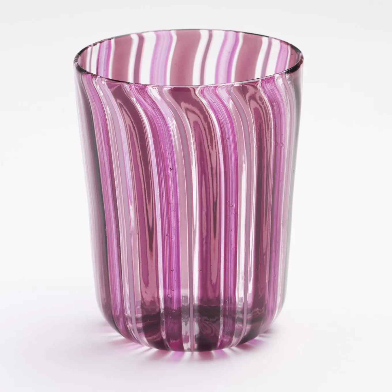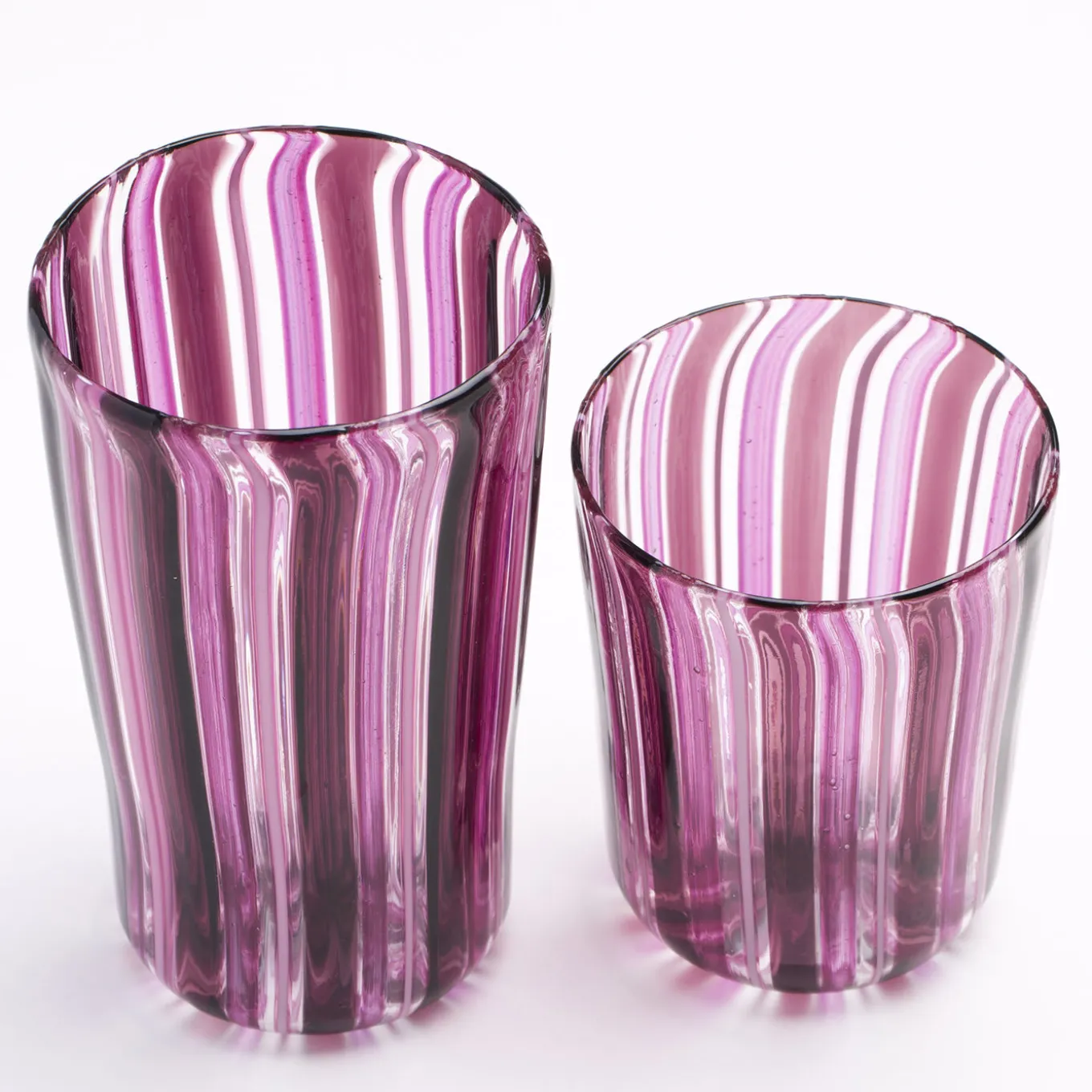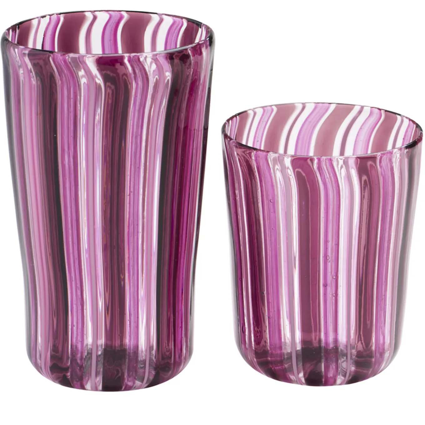 Set di 12 bicchieri di Murano realizzati con la tecnica “a Canna”, in cui canne di vetro colorato vengono fuse in una base di vetro trasparente. Questo bellissimo set ametista e rosa comprende 6 bicchieri da acqua e 6 bicchieri da vino interamente realizzati a mano sull’isola veneziana di Murano dai maestri soffiatori de La Fornasotta.