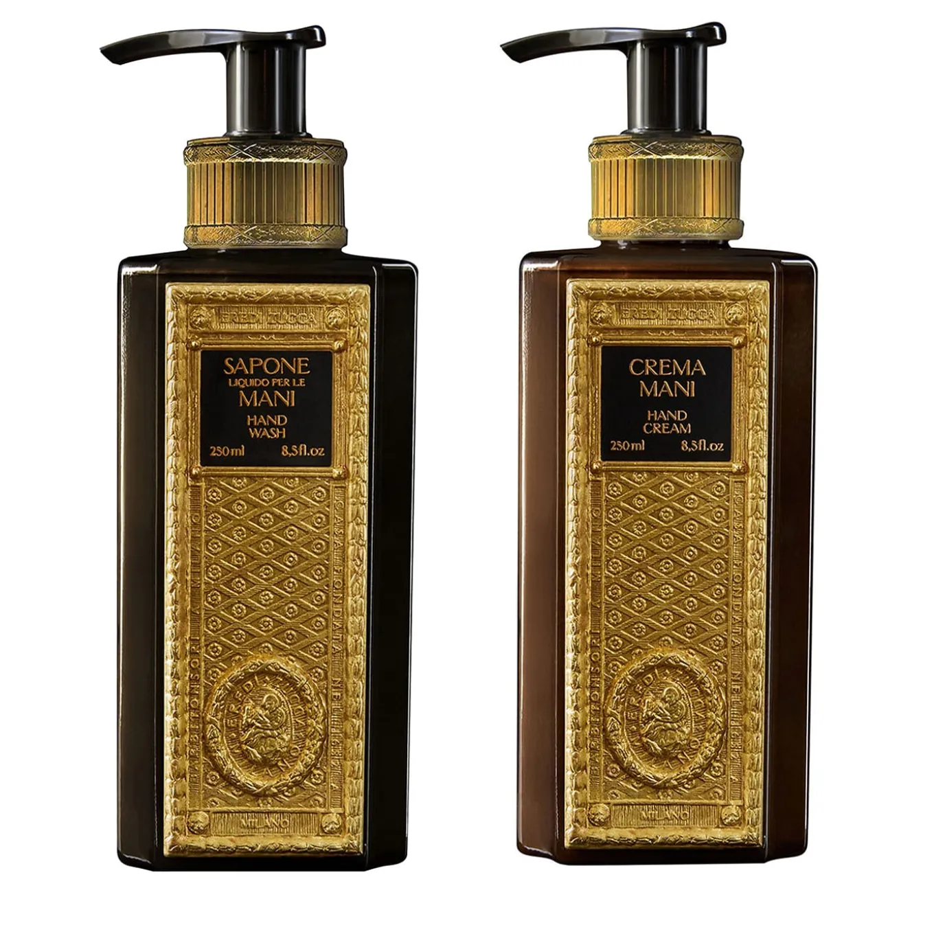 Il set di crema e detergente per le mani Eredi Zucca offre una lussuosa miscela di nutrimento e protezione. Arricchite con burro di karité e kokum, entrambe le formule creano una barriera setosa per una pelle morbida e idratata. L’allantoina, unita agli idroestratti di salvia e lavanda provenienti da filiere italiane certificate, offre un’esperienza lenitiva e rinfrescante. Infuso con la fragranza floreale-agrumata di Bigli, ogni prodotto è elegantemente presentato in un flacone PETG marrone da 250 ml con dettagli in ottone Eredi Zucca.