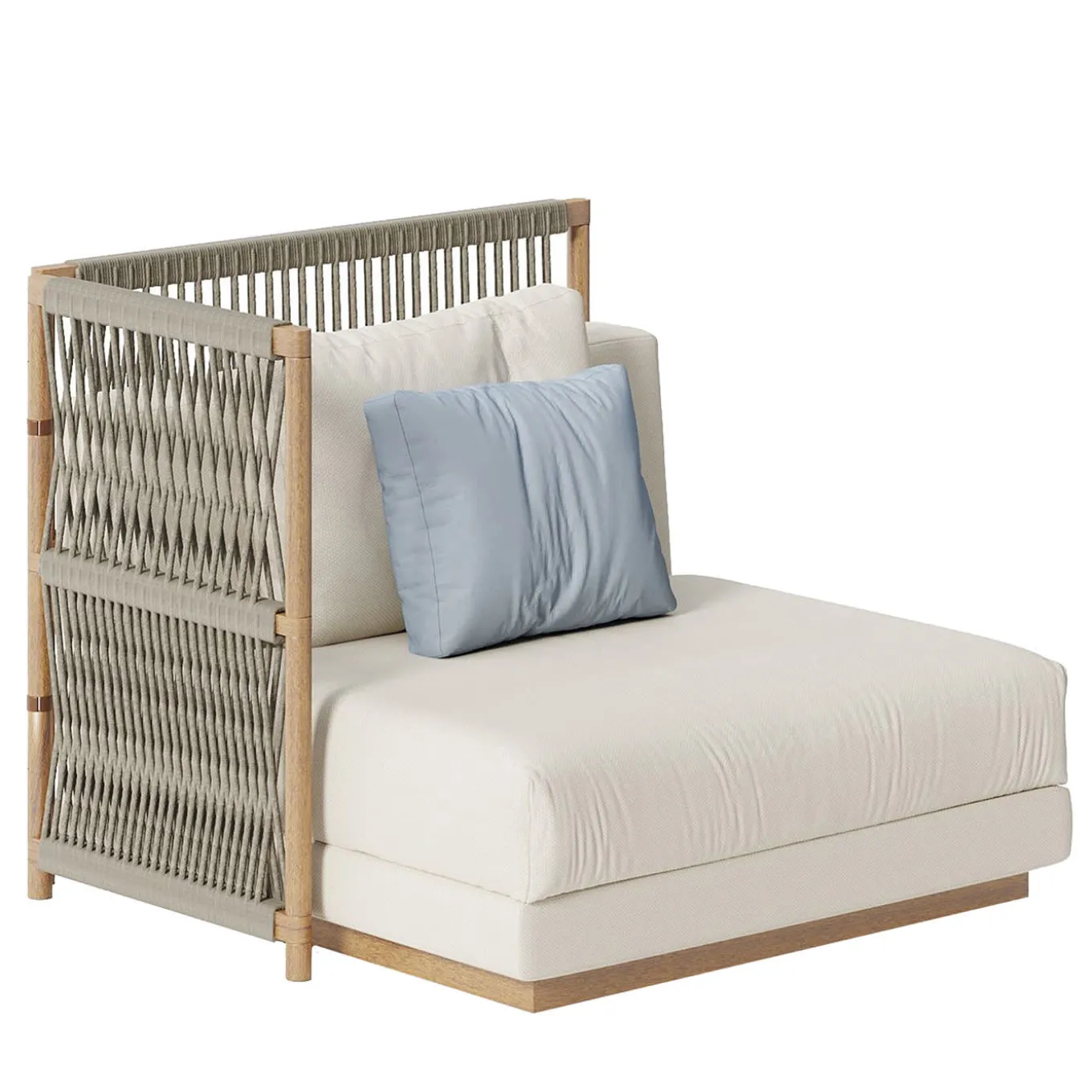 Un ipnotizzante motivo di corde intrecciate color tortora abbellisce la lineare struttura in Iroko di questo divano angolare, parte di un sistema modulare che suggerisce molteplici composizioni da godere in buona compagnia. Evocando la tessitura tradizionale, il telaio posteriore avvolto da corde è abbinato a un rivestimento in tessuto beige brillante e a una generosa imbottitura interna. Inclusi due cuscini in tessuto di categoria B. La struttura posteriore in iroko e corda verde è inclusa nel prezzo ma opzionale.