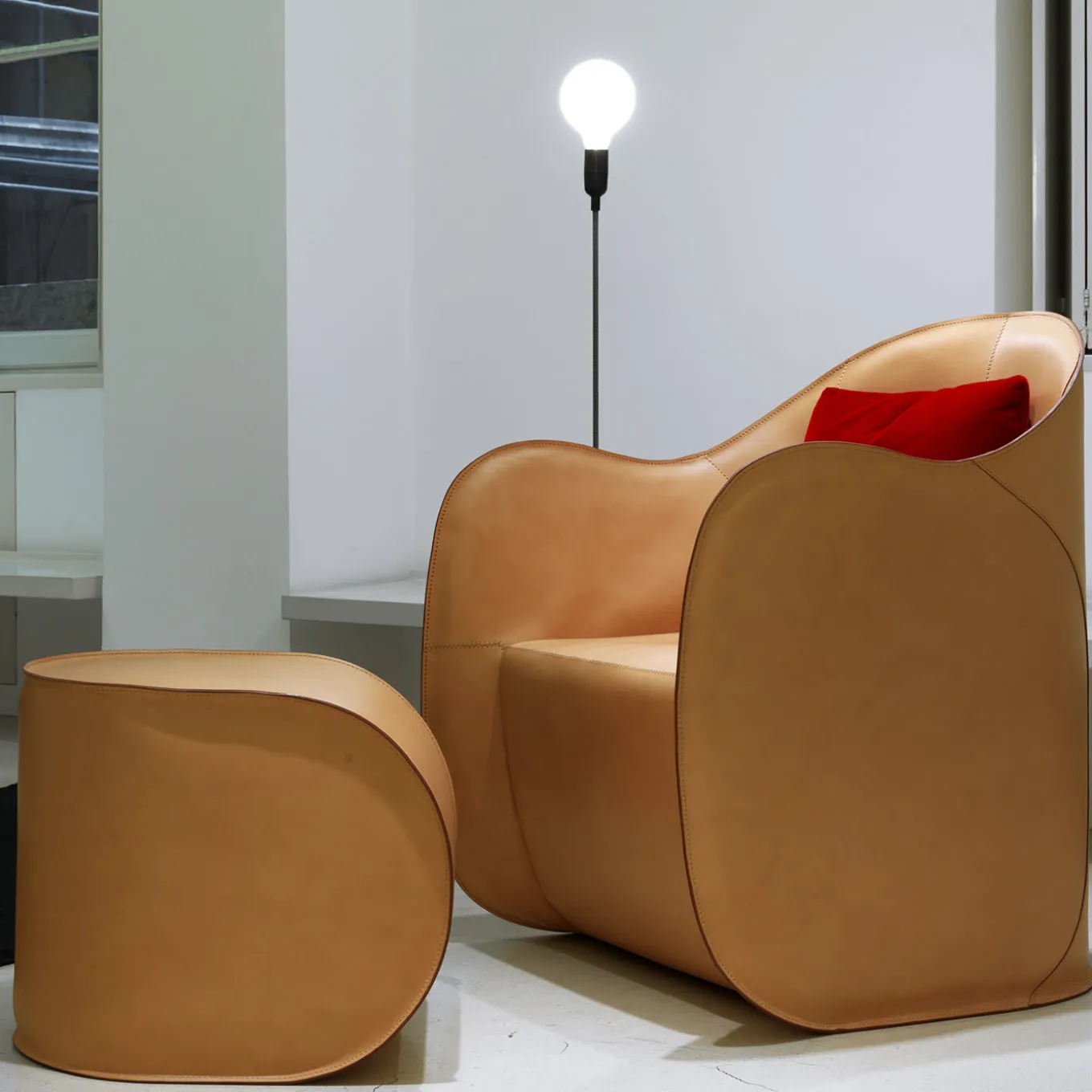 Disegnato da Alberto Colzani nel 2013, questo set di poltrona e pouf aggiungerà raffinatezza e un tocco di colore a un salotto o a uno studio moderno. L’anima in poliuretano crea la forma sinuosa e avvolgente della poltrona, che si rispecchia nella silhouette ripiegata del pouf. Senza alcun supporto interno, la scocca in poliuretano e la pelle bovina che la riveste, cucite insieme, diventano un tutt’uno e sono sia superficie che struttura, creando un pezzo che segue il movimento del corpo. Il rivestimento è disponibile in 30 colori – si prega di chiedere al concierge per le modifiche.