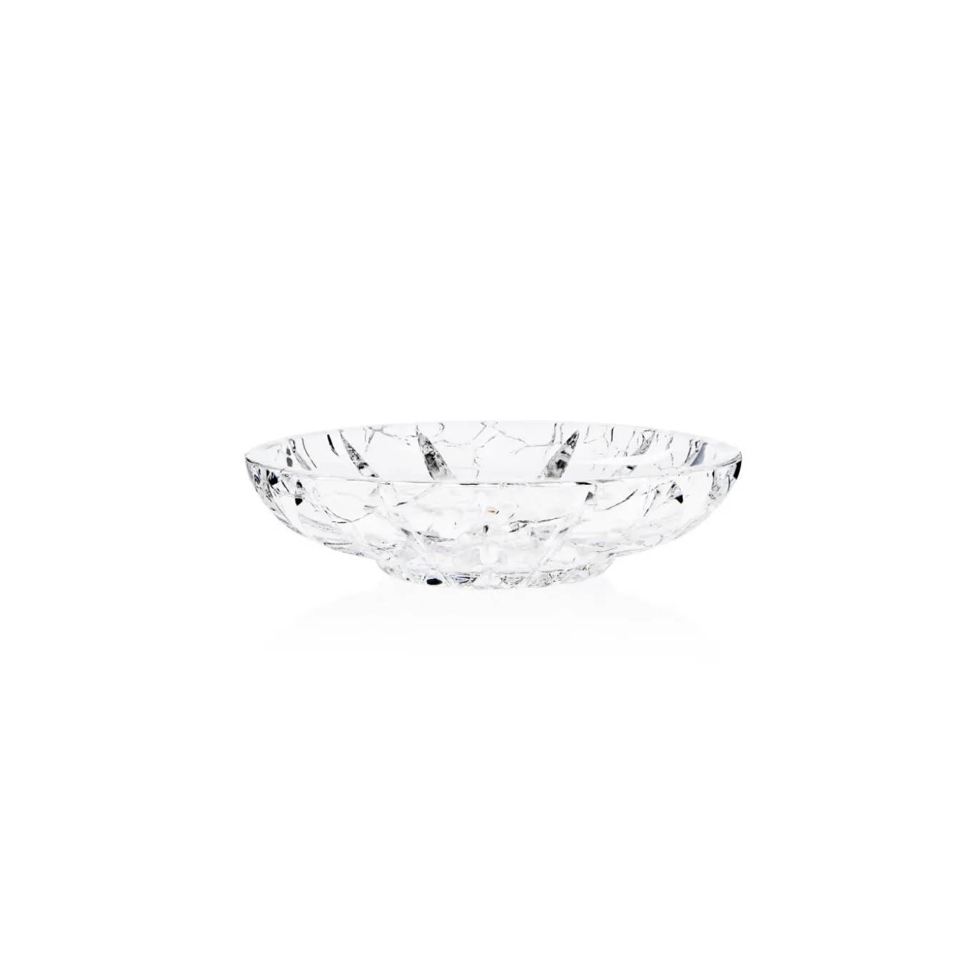 Questo elegante set, che fa parte della collezione Trickerey, è un complemento ideale per una toilette o un bagno moderno. I pezzi sono stati realizzati in vetro trasparente con una suggestiva texture ottenuta combinando una rete irregolare di crepe che corre su una serie di scanalature parallele e curvilinee. Il senso di movimento che ne deriva è sofisticato e senza tempo. I due pezzi sono: un portasapone (15 cm) e un portasapone con dispenser in metallo (7,8 cm e H 20,5 cm).