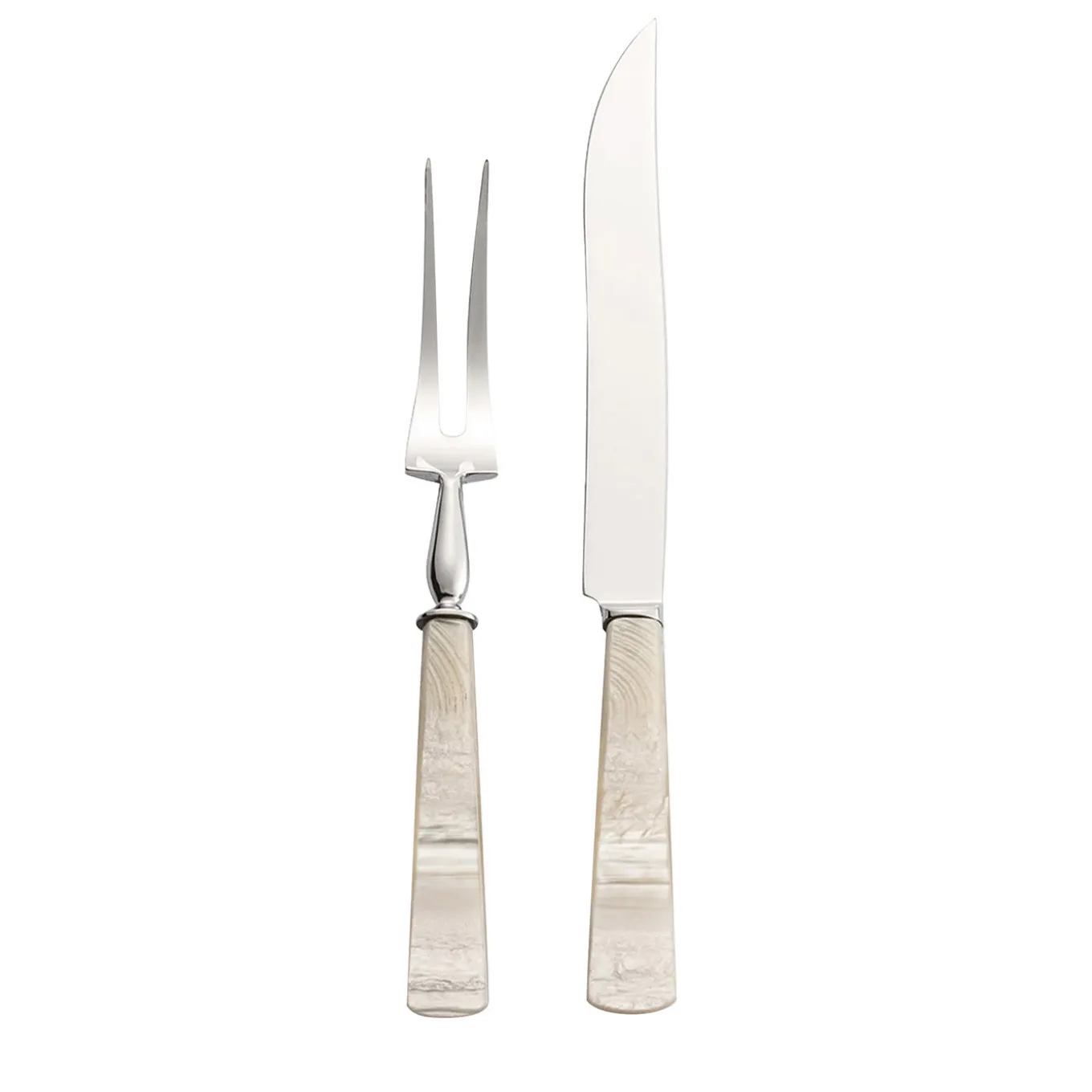 L’attenzione alla sostenibilità si traduce in un incentivo a esplorare materiali all’avanguardia per questo delizioso set di posate, che comprende una forchetta e un coltello per porzionare elegantemente l’arrosto agli ospiti. I manici, delicatamente svasati, sono realizzati in bioresina Meba, a base vegetale e sostenibile, che ricrea la caratteristica texture e la qualità iridescente che contraddistinguono la vera madreperla. Linee classiche e armoniose tracciano il profilo delle tomaie in acciaio inossidabile scintillante.