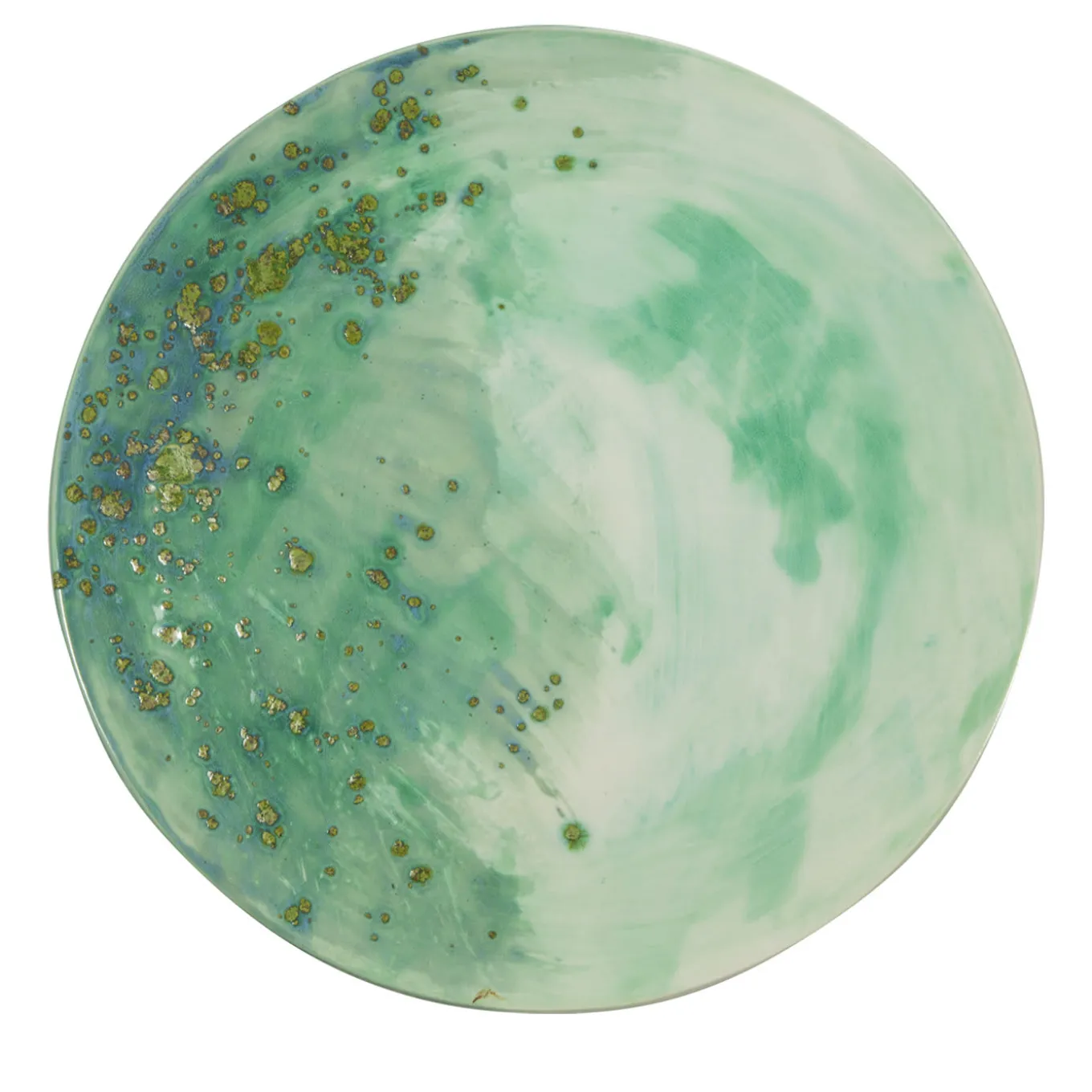 Questo sorprendente set di piatti in ceramica è caratterizzato da vivaci macchie verdi irregolari che ornano la delicata tonalità verde chiaro delle loro superfici satinate. Frutto della maestria artigianale, questi piatti sono tutti dipinti a mano, il che rende ogni pezzo un oggetto unico che può variare leggermente nell’aspetto rispetto alla foto. Il set comprende un piatto piano, un piatto fondo, una fruttiera e un piatto da portata che può essere utilizzato anche come vassoio, tutti colorati con materiali atossici.