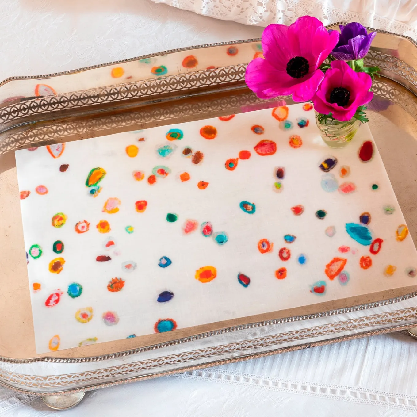 Questa opera d’arte dipinta a mano è stata stampata in digitale su lino; ogni pezzo è tagliato da un motivo molto grande, quindi tutti i tappetini saranno diversi l’uno dall’altro, formando una tavola unica. Il tessuto è incorporato in un’esclusiva soluzione poliuretanica con la più morbida sensazione di pelle di pesca. Le tovagliette sono resistenti al calore, alle abrasioni e alle macchie, leggere e totalmente flessibili, possono essere lavate con acqua e sapone. La trama del lino è ricca e visibile, così come gli effetti del pennello e l’esperienza cromatica dell’artista.