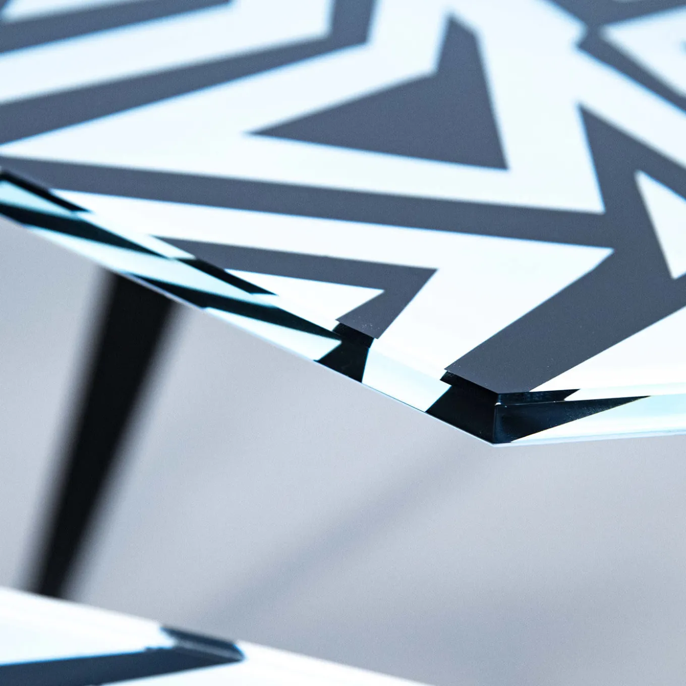 Questo trio di tavolini è caratterizzato da un carattere forte, internazionale, elegante e innovativo. Ogni tavolino è un pezzo unico. È realizzato a mano su ordinazione con la massima cura e attenzione ai dettagli. L’intera struttura portante è realizzata in ottone con finitura nera opaca. Il piano di forma geometrica è in cristallo inciso a mano nella parte inferiore. Ogni pezzo è unico e, a causa della lavorazione artigianale, possono verificarsi lievi variazioni. Per ulteriori informazioni, rivolgersi al Concierge.