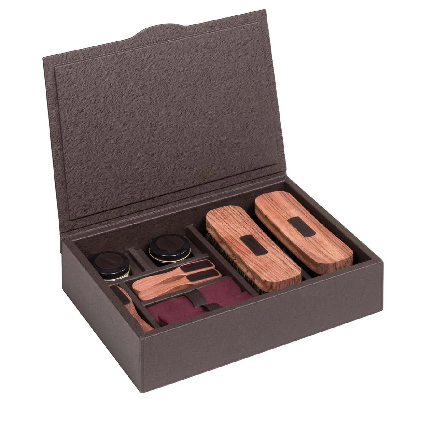 Scatola con struttura e divisori in legno rivestiti in pelle, dotata di coperchio a cerniera. Set dotato dei seguenti strumenti: 2 spazzole per lucidare con setole di crine, 2 spazzole per applicare il lucido con setole di crine, 1 mini spazzola con setole sintetiche e in ottone per il camoscio, 2 panni morbidi per lucidare, 2 paste per lucidare le scarpe. Tutte le spazzole hanno una struttura in legno di Bubinga.
