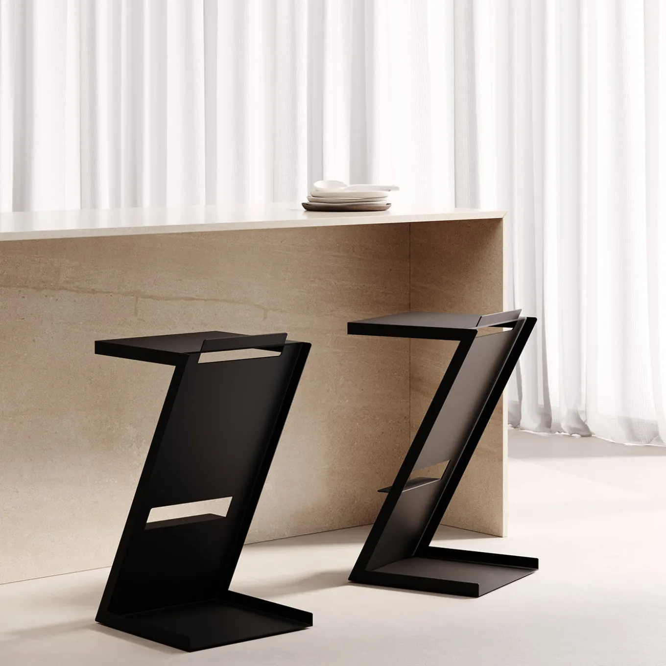 Ricavato da un’unica lastra di ferro, il profilo dinamico a “Z” di questo sgabello offre un impatto visivo e un comfort ergonomico. Disegnato da Marco Ripa, la sua elegante finitura nera mette in risalto le linee pulite e angolari, mentre il poggiapiedi integrato e la maniglia ritagliata aggiungono funzionalità, rendendolo facile da sollevare e spostare. Ideale per bar, cucine e caffè moderni, questo pezzo combina un’estetica minimalista con una struttura robusta, aggiungendo un tocco contemporaneo a qualsiasi ambiente.