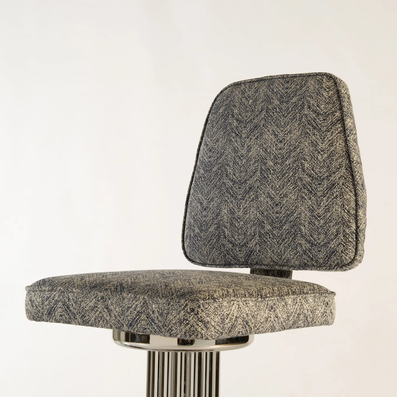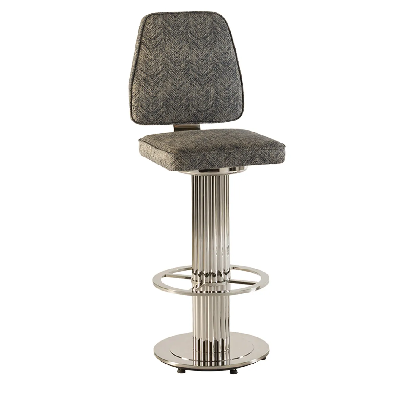 Lo sgabello da bar Alisa in ottone presenta una struttura in acciaio cromato con una finitura argentata lucida. Lo sgabello è progettato con una base rotonda e un supporto circolare per i piedi attorno alla colonna centrale. Il sedile e lo schienale tappezzati in un tessuto testurizzato offrono comfort mantenendo un aspetto contemporaneo. Adatto per uso interno ed esterno, questo sgabello di dimensioni medie bilancia durabilità e stile raffinato.