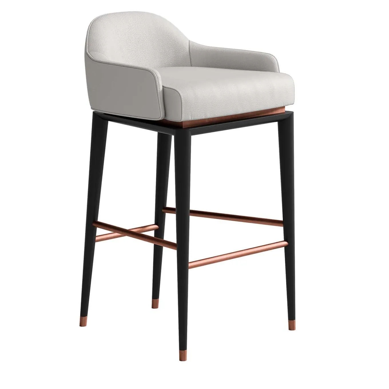 Linee architettoniche e silhouette confortevole definiscono questo squisito sgabello da bar della collezione Sesto Senso. La seduta imbottita, lo schienale basso e arrotondato e i braccioli sono rivestiti in pelle bianca (cat. A) e poggiano su quattro gambe nere inclinate con ghiere in metallo finitura rame. Solido e chic, questo versatile sgabello è un accogliente posto a sedere per gli ospiti in salotto o intorno a un’isola della cucina, e offre un tocco di glamour in qualsiasi arredamento casual, dal tradizionale al moderno.