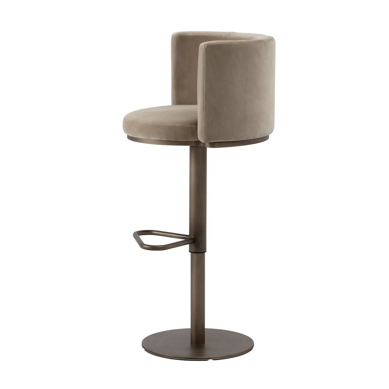 57Parte della collezione Virna, caratterizzata da una silhouette arrotondata e da finiture lussuose, questo sgabello da bar riunisce il meglio dello stile moderno e retrò. Completamente rivestito in velluto color tortora, il sedile girevole è superbamente imbottito in poliuretano per garantire il massimo comfort, arricchito da uno schienale curvo e avvolgente. La base a piedistallo in ferro (non regolabile) con pratico poggiapiedi è rifinita in ottone spazzolato e una protezione per il pavimento in nylon sotto la base rotonda completa questo notevole sgabello da esporre con orgoglio su qualsiasi tavolo da cucina o da cocktail. Certificazioni commerciali e contrattuali disponibili su richiesta.