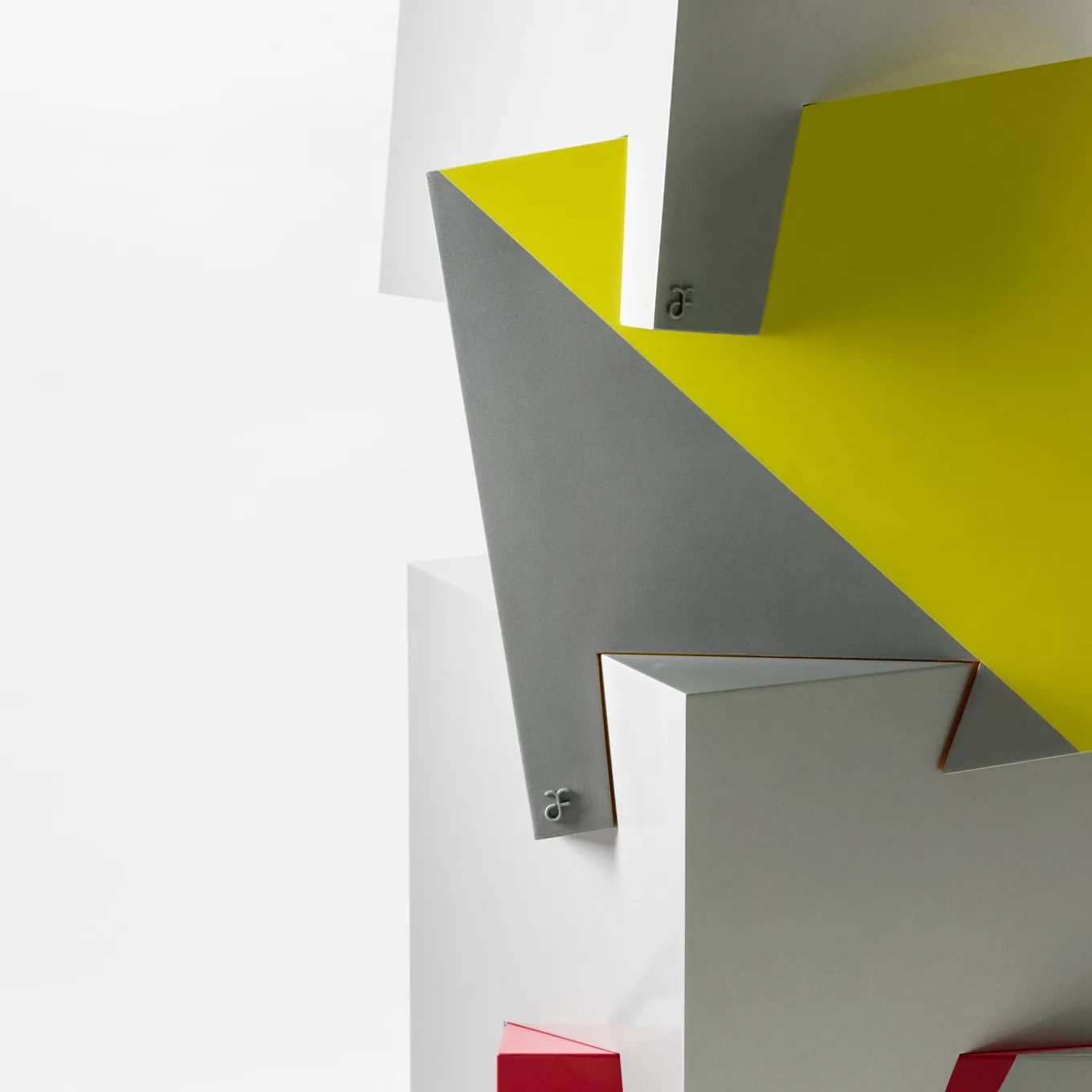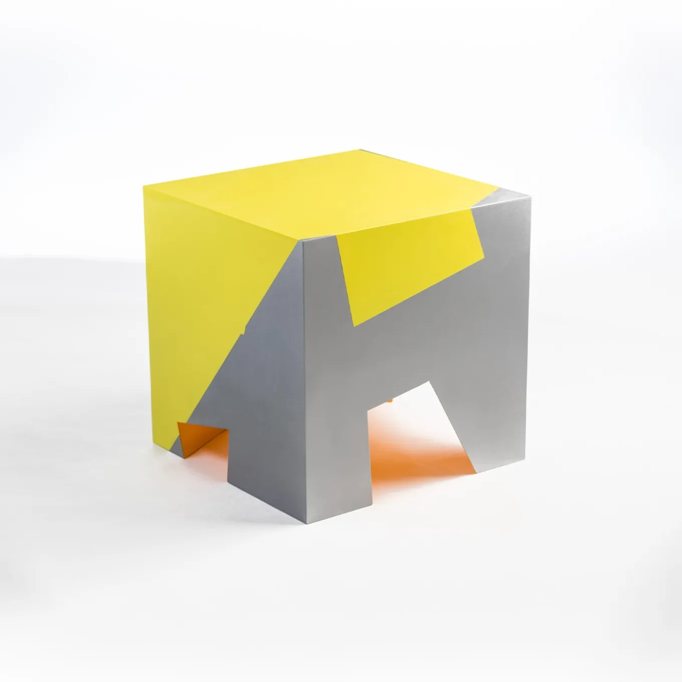 Parte di una serie di cinque pezzi che possono essere incastrati per creare una spettacolare scultura totemica, questo sgabello basso è un omaggio alla geometria pura reinventata in una versione vivace e creativa. Tratti irregolari delineano i dinamici piedi incorporati e tracciano i contorni del disegno giallo limone che accentua la seduta. Realizzato su ordinazione, è un pezzo unico artigianale in alluminio che esprimerà liberamente il suo carattere nelle case contemporanee.