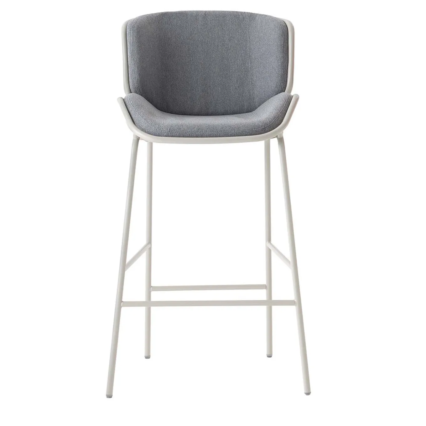 Questo sgabello pulito ed ergonomico di Giacomo Cattani si inserisce con decisione in un ambiente contemporaneo. Presenta una silhouette sottile ma robusta, con lunghe e sottili gambe cilindriche in metallo laccato bianco (RAL 7035) collegate a coppie con una barra orizzontale che funge da poggiapiedi. Il cuscino è rivestito in tessuto grigio (fox cat. C col. 9805). Sono disponibili altre finiture e tonalità, per informazioni rivolgersi al Concierge.