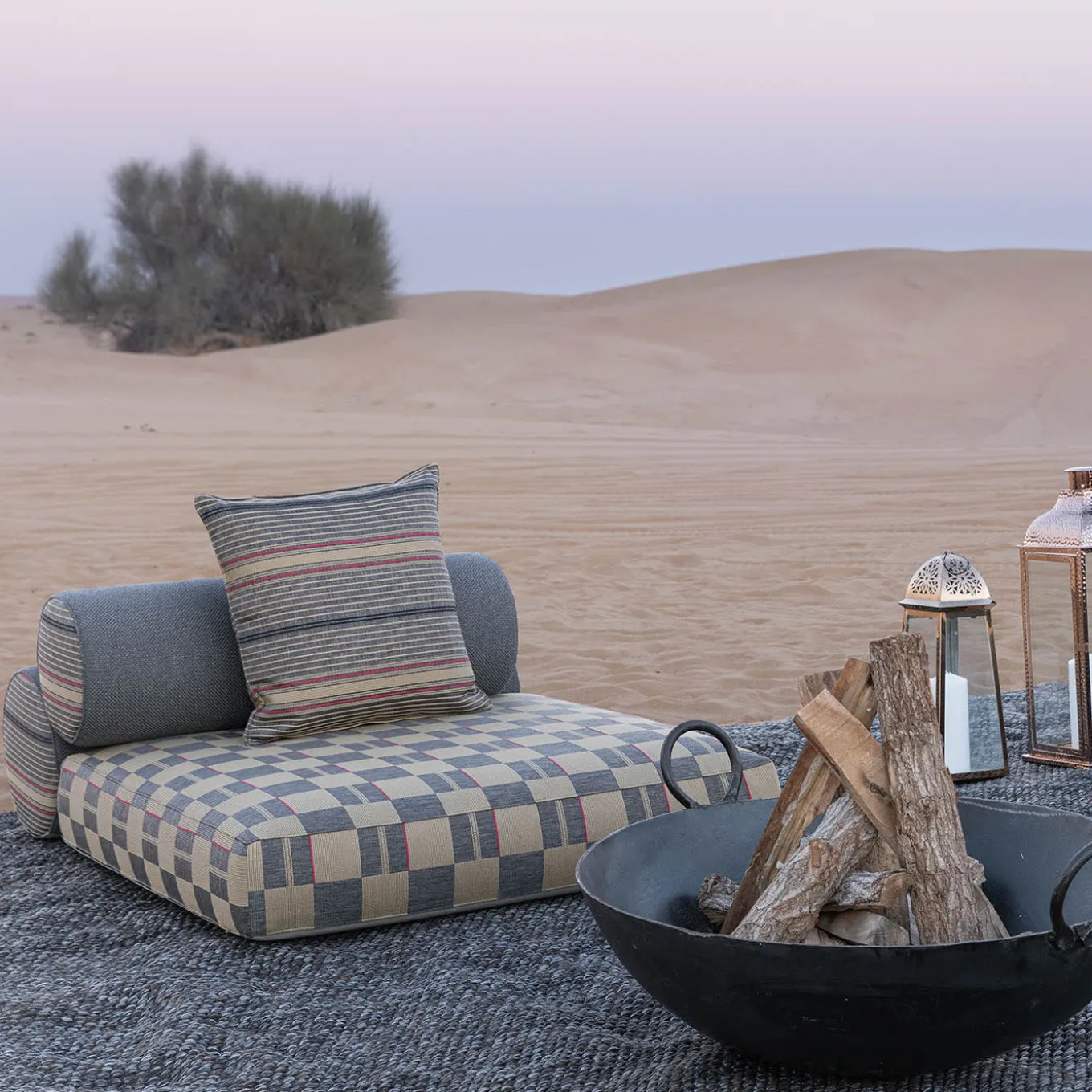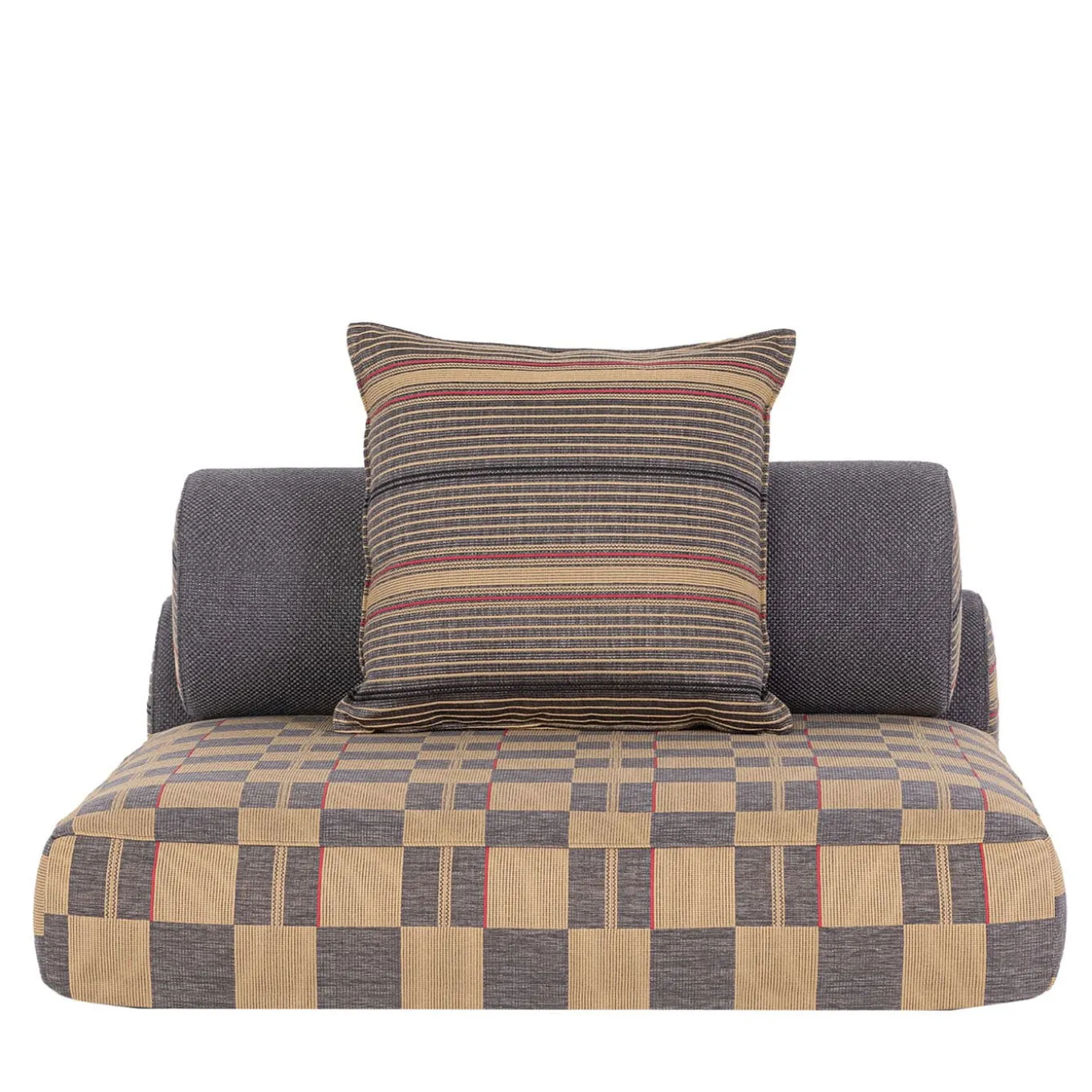 Unità centrale di un più ampio sistema di sedute modulari, questo progetto deve il suo nome allo spazio tradizionalmente dedicato alla convivialità nelle case arabe. Rivestito in un sofisticato tessuto a fantasia in polipropilene 100% lavabile e sfoderabile, i suoi volumi morbidi comprendono una generosa seduta con parte inferiore in Batyline, per un design da pavimento sicuro che resiste ad abrasioni e rotture. Un paio di cuscini a forma di rotolo che fungono da schienale completano il pezzo. Il prezzo include i cuscini decorativi, come mostrato nell’immagine, e la copertura protettiva per ogni modulo.