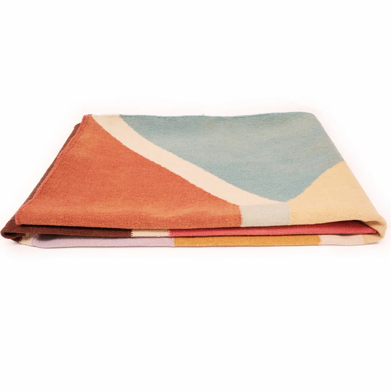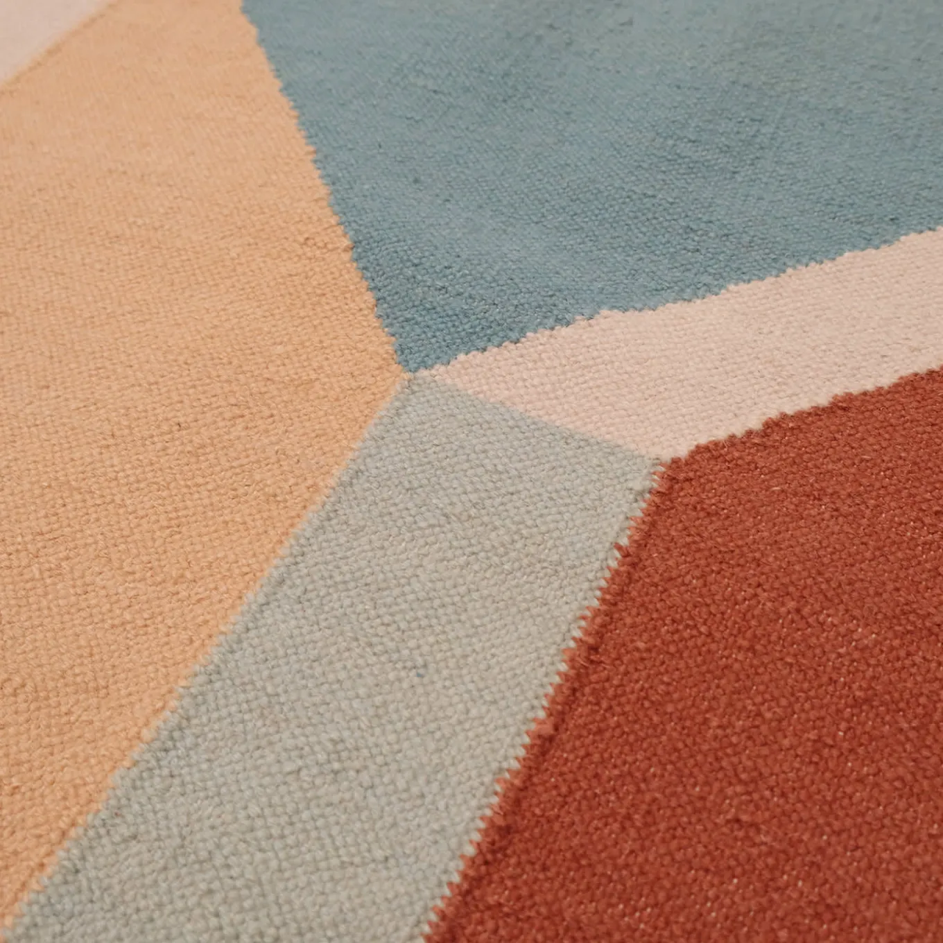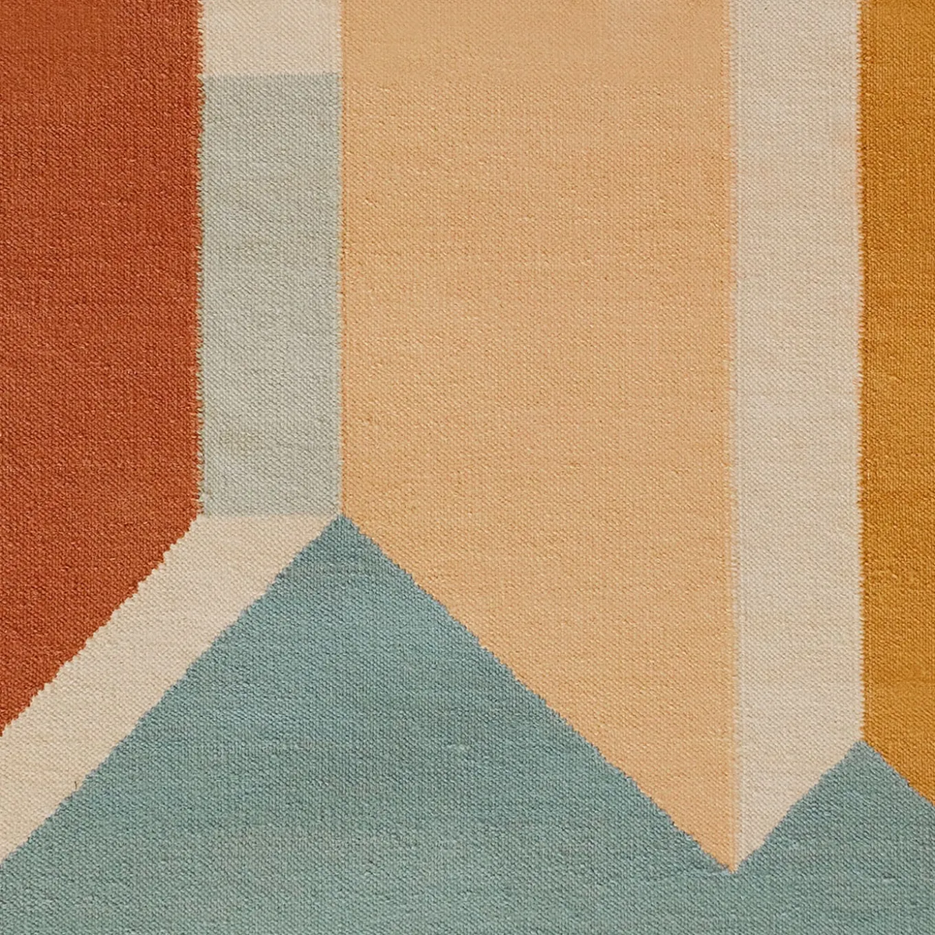 Questo tappeto presenta una composizione unica di forme geometriche. Il disegno è impreziosito da toni terrosi che ricordano le sfumature del tramonto. L’architettura da sogno rappresentata sul tappeto di lana crea un elemento elegante per qualsiasi spazio interno.