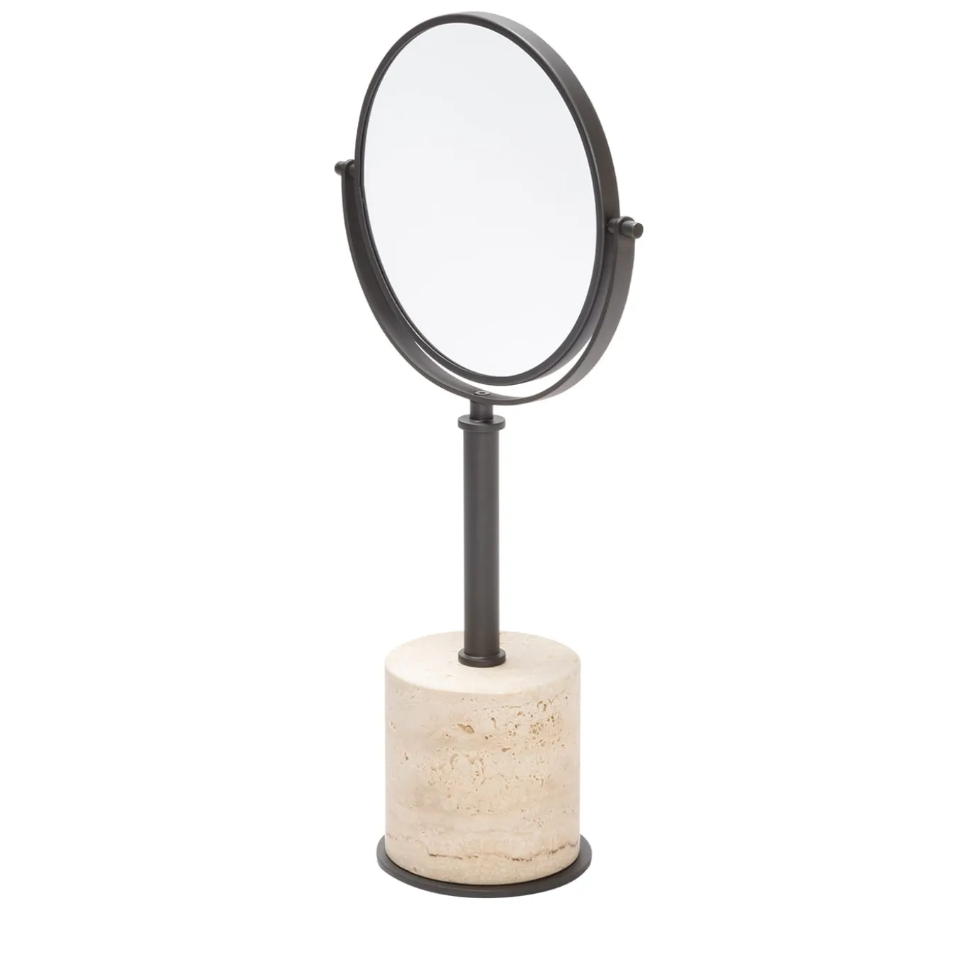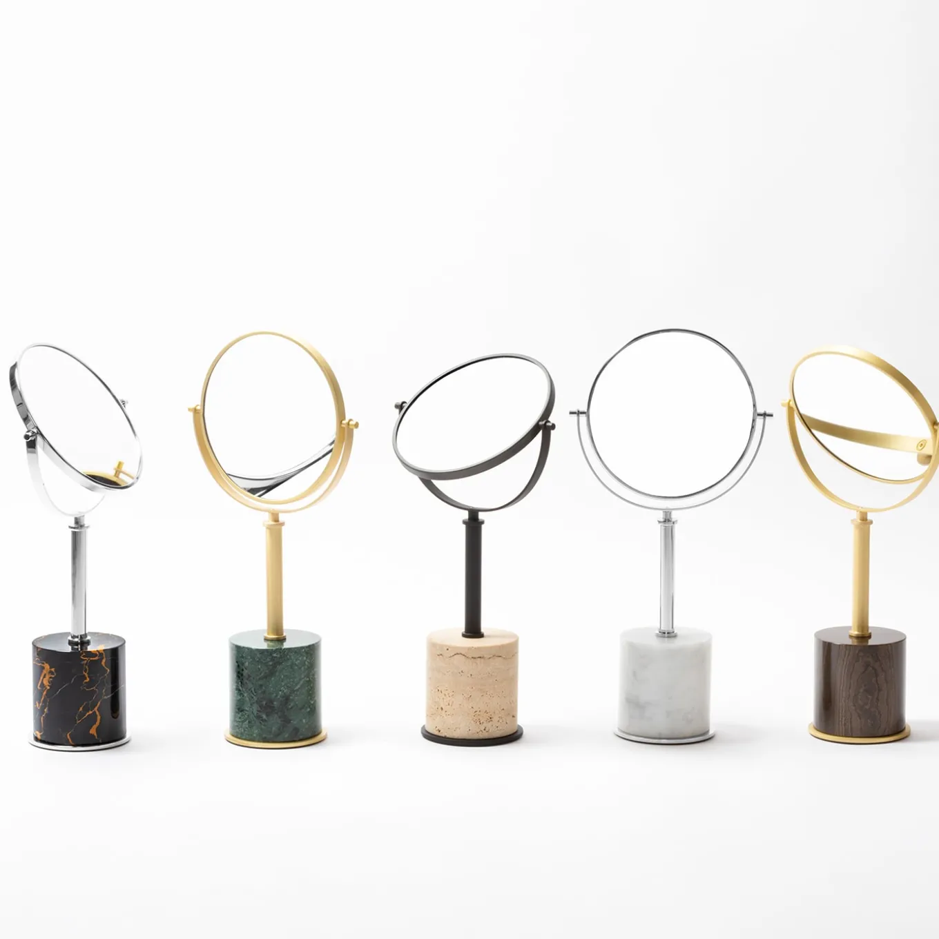 Struttura in metallo disponibile in diverse finiture con una pesante base in marmo che garantisce una perfetta stabilità. Lo specchio ruota a scelta tra ingrandimento 2x e riflessione standard. Finiture di marmo disponibili: Arabescato bianco / verde Guatemala / Eramosa marrone / nero Portoro / Travertino. Finiture in metallo disponibili: cromo / bronzo / ottone.