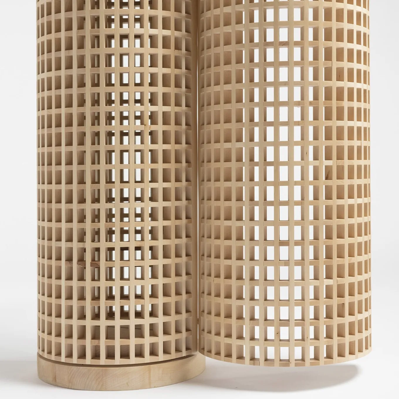 Niente sintetizza l’essenza del “decoro funzionale” meglio di questo specchio free-standing. Poggiata su una base modellata, la sottile struttura cilindrica in calce massiccia di questo design può essere socchiusa per rivelare lo specchio al suo interno, come uno scrigno rivela le monete d’oro che contiene. Il disegno a griglia conferisce al pezzo una leggerezza visiva e un senso di sottile rigore, mitigato dalle linee morbide.